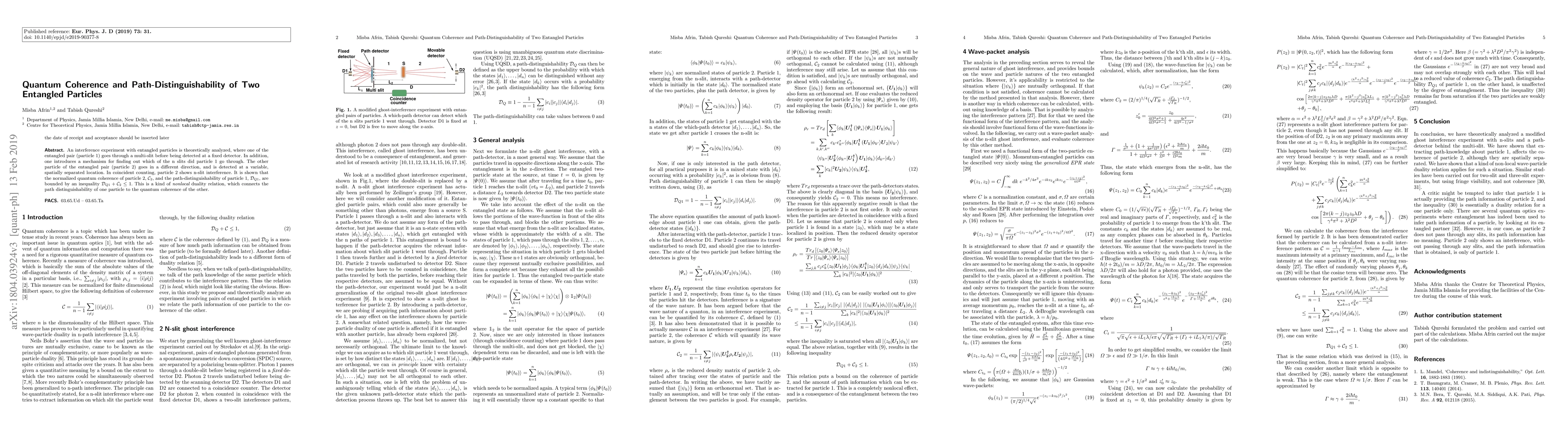 An interference experiment with entangled particles is theoretically analyzed, where one of the entangled pair (particle 1) goes through a multi-slit before being detected at a fixed detector. In addition, one introduces a mechanism for finding out which of the n slits did particle 1 go through. The other particle of the entangled pair (particle 2) goes in a different direction, and is detected at a variable, spatially separated location. In coincident counting, particle 2 shows n-slit interference. It is shown that the normalized quantum coherence of particle 2, $\mathcal{C}_2$, and the path-distinguishability of particle 1, $\mathcal{D}_{Q1}$, are bounded by an inequality $\mathcal{D}_{Q1} + \mathcal{C}_2 \le 1$. This is a kind of {\em nonlocal} duality relation, which connects the path distinguishability of one particle to the quantum coherence of the other.