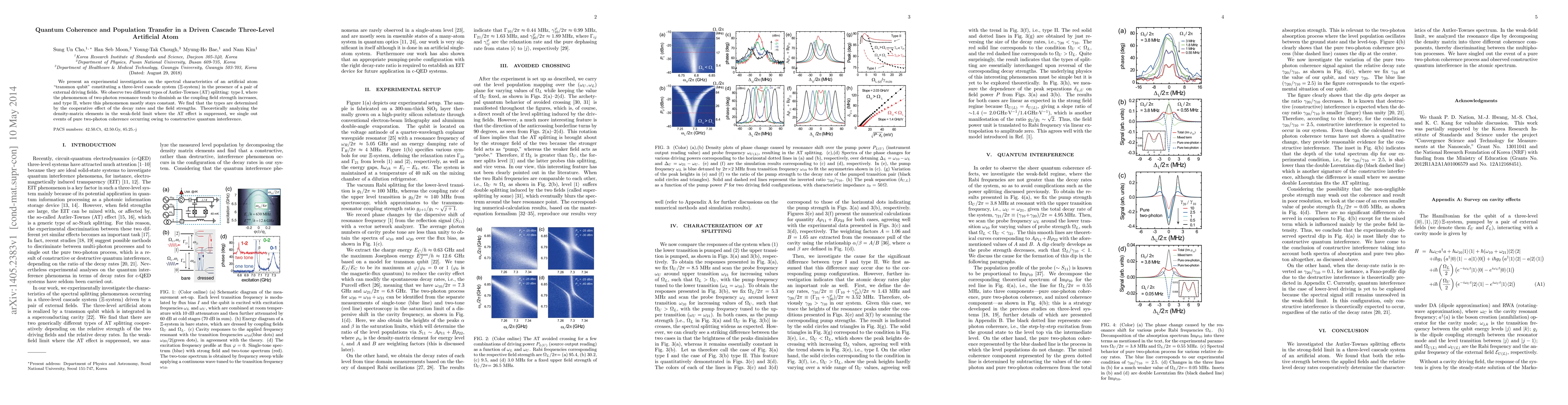 Researchers investigate the effects of driving fields on a three-level artificial atom, finding two types of Autler-Townes splitting based on decay rates and field strengths, and observing pure two-photon coherence due to quantum interference.
