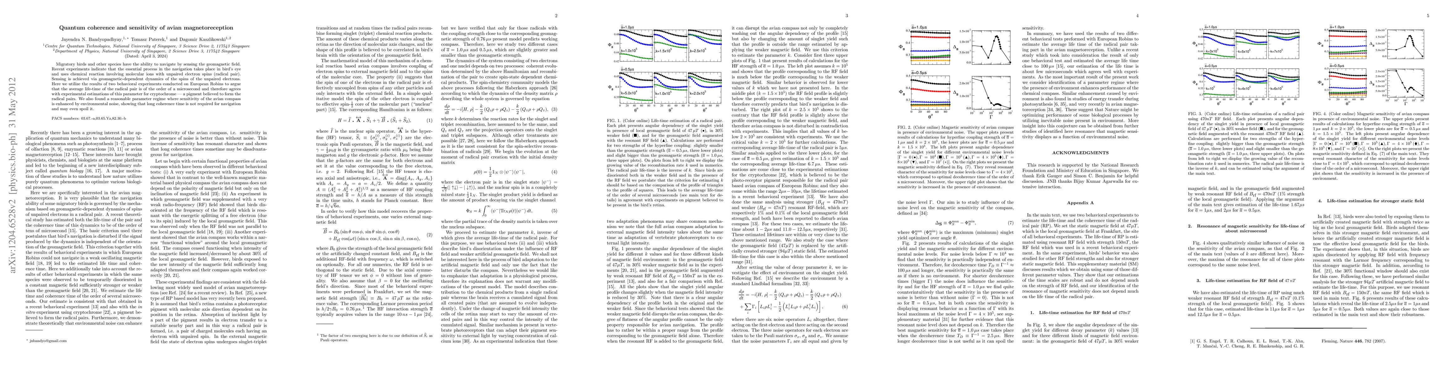 Migratory birds and other species have the ability to navigate by sensing the geomagnetic field. Recent experiments indicate that the essential process in the navigation takes place in bird's eye and uses chemical reaction involving molecular ions with unpaired electron spins (radical pair). Sensing is achieved via geomagnetic-dependent dynamics of the spins of the unpaired electrons. Here we utilize the results of two behavioral experiments conducted on European Robins to argue that the average life-time of the radical pair is of the order of a microsecond and therefore agrees with experimental estimations of this parameter for cryptochrome --- a pigment believed to form the radical pairs. We also found a reasonable parameter regime where sensitivity of the avian compass is enhanced by environmental noise, showing that long coherence time is not required for navigation and may even spoil it.