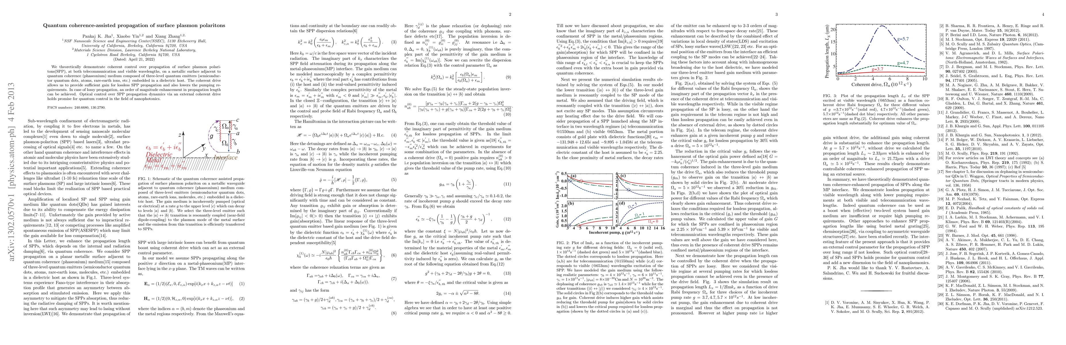 This paper demonstrates theoretical control over the propagation of surface plasmon polaritons using quantum coherence from a medium of three-level quantum emitters, achieving lossless propagation and significant enhancement in propagation length, with potential applications in quantum nanophotonics.