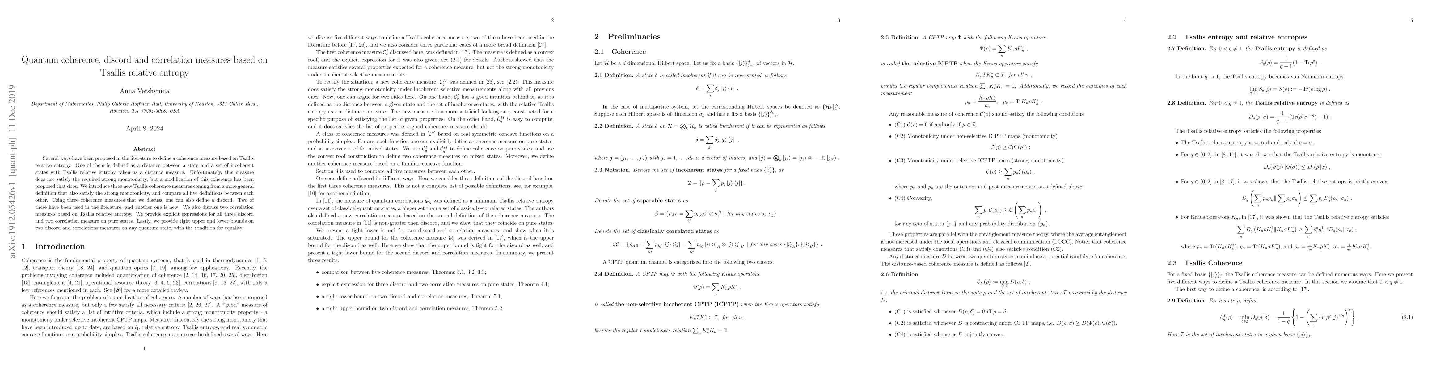 This paper introduces three new Tsallis coherence measures that satisfy strong monotonicity, compares them with existing definitions, and defines discord and correlation measures based on Tsallis relative entropy. It also provides explicit expressions and bounds for these measures on pure and general quantum states.