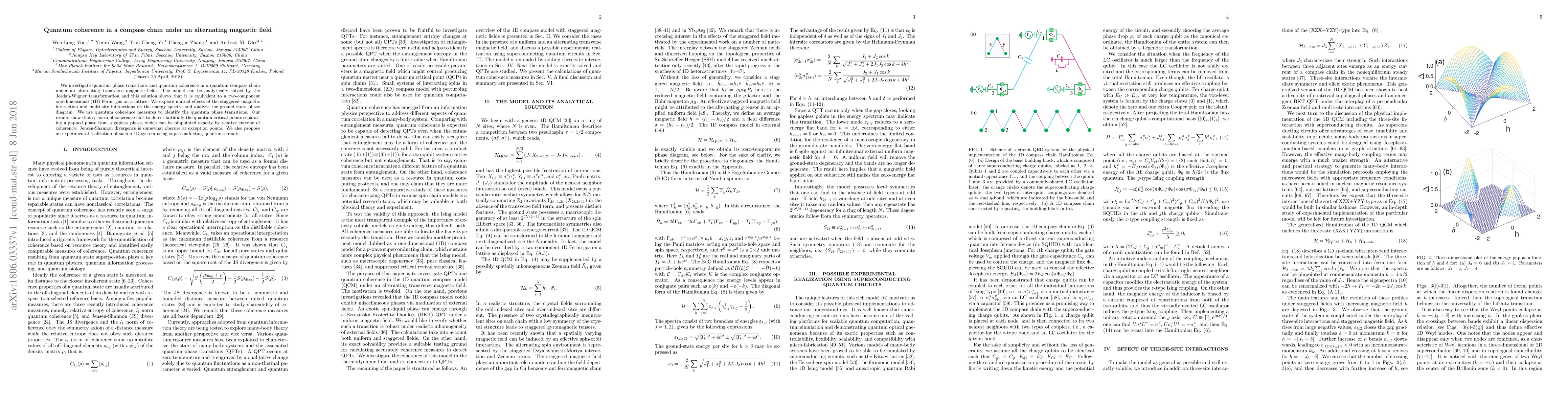 This paper investigates quantum phase transitions in a quantum compass chain under an alternating magnetic field, revealing that the system is equivalent to a 1D Fermi gas. Quantum coherence measures are used to identify phase transitions, with relative entropy of coherence proving more effective than $l_1$ norm in detecting critical points. An experimental setup using superconducting quantum circuits is proposed for realization.