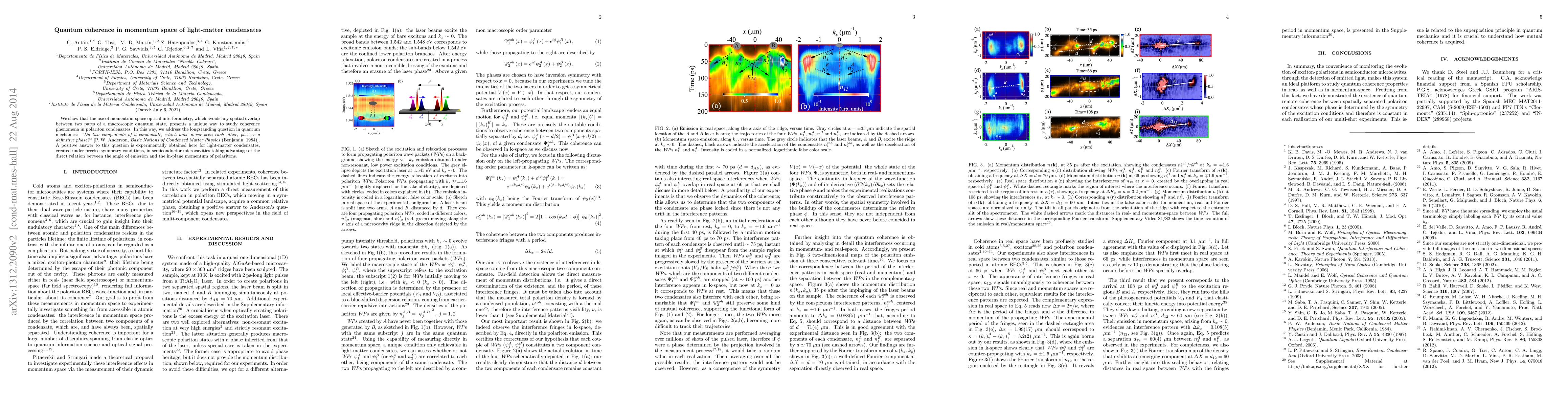 We show that the use of momentum-space optical interferometry, which avoids any spatial overlap between two parts of a macroscopic quantum state, presents a unique way to study coherence phenomena in polariton condensates. In this way, we address the longstanding question in quantum mechanics: "\emph{Do two components of a condensate, which have never seen each other, possess a definitive phase?}" [P. W. Anderson, \emph{Basic Notions of Condensed Matter Physics} (Benjamin, 1984)]. A positive answer to this question is experimentally obtained here for light-matter condensates, created under precise symmetry conditions, in semiconductor microcavities taking advantage of the direct relation between the angle of emission and the in-plane momentum of polaritons.
