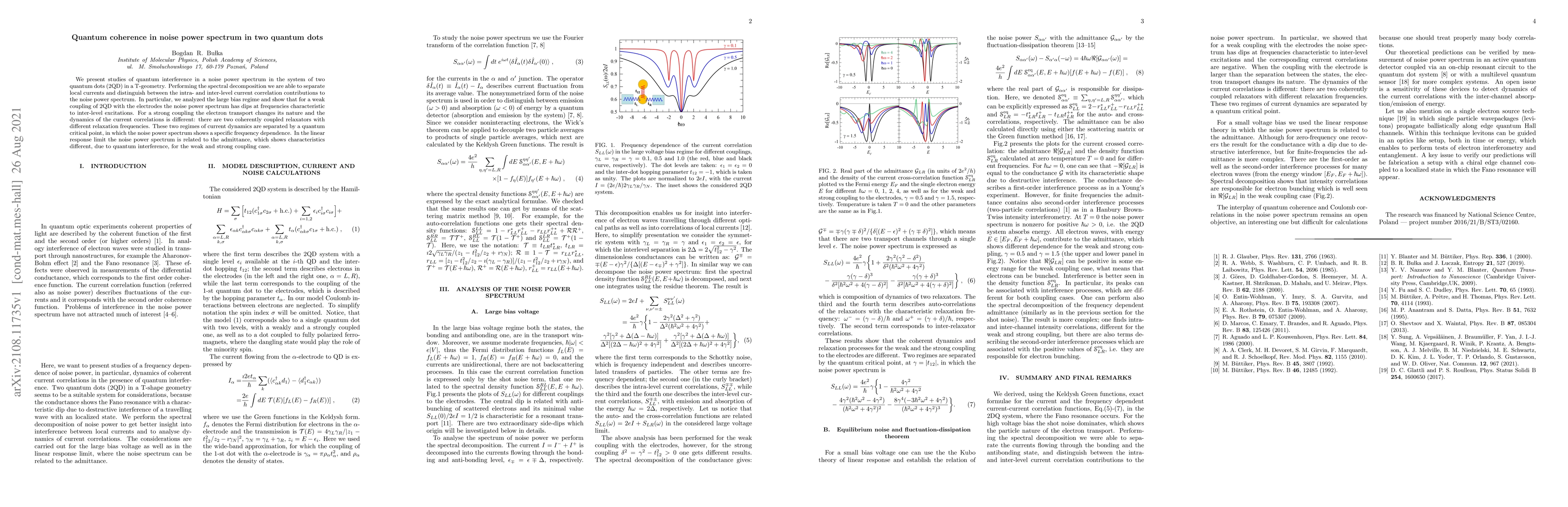 This paper investigates quantum interference in the noise power spectrum of a two-quantum dot system, revealing distinct current dynamics in weak and strong coupling regimes. It identifies characteristic dips in the noise spectrum for weak coupling and two coherently coupled relaxators for strong coupling, separated by a quantum critical point.