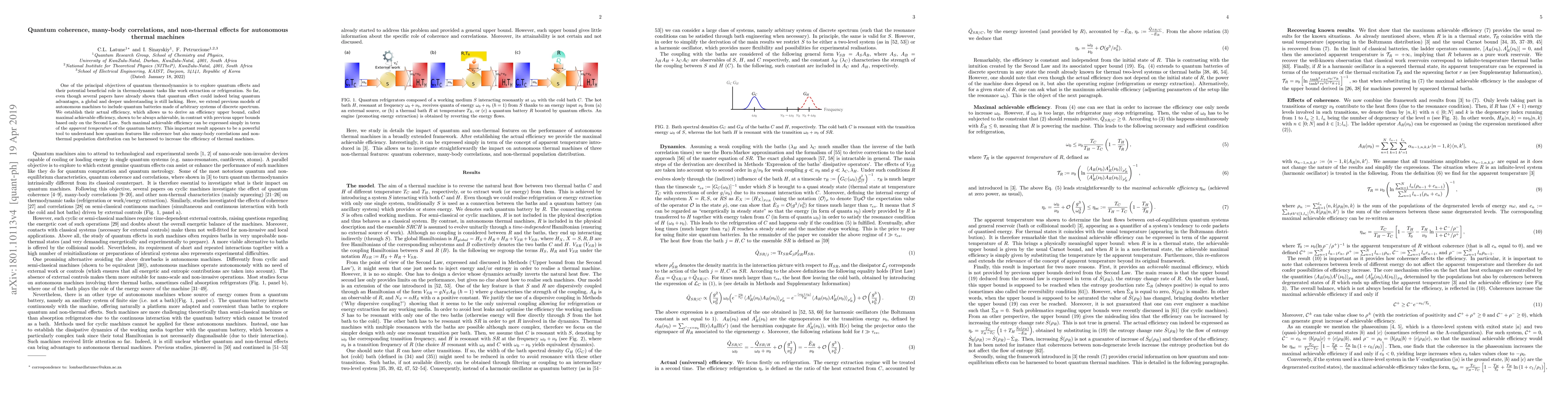 One of the principal objectives of quantum thermodynamics is to explore quantum effects and their potential beneficial role in thermodynamic tasks like work extraction or refrigeration. So far, even though several papers have already shown that quantum effect could indeed bring quantum advantages, a global and deeper understanding is still lacking. Here, we extend previous models of autonomous machines to include quantum batteries made of arbitrary systems of discrete spectrum. We establish their actual efficiency, which allows us to derive an efficiency upper bound, called maximal achievable efficiency, shown to be always achievable, in contrast with previous upper bounds based only on the Second Law. Such maximal achievable efficiency can be expressed simply in term of the it apparent temperature of the quantum battery. This important result appears to be a powerful tool to understand how quantum features like coherence but also many-body correlations and non-thermal population distribution can be harnessed to increase the efficiency of thermal machines.