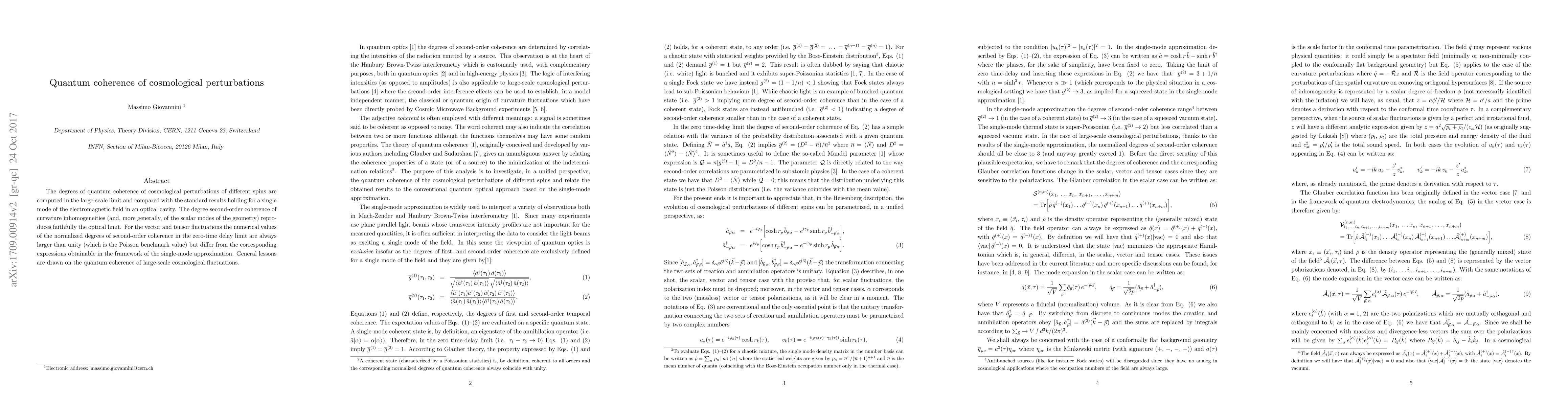 The degrees of quantum coherence of cosmological perturbations of different spins are computed in the large-scale limit and compared with the standard results holding for a single mode of the electromagnetic field in an optical cavity. The degree second-order coherence of curvature inhomogeneities (and, more generally, of the scalar modes of the geometry) reproduces faithfully the optical limit. For the vector and tensor fluctuations the numerical values of the normalized degrees of second-order coherence in the zero-time delay limit are always larger than unity (which is the Poisson benchmark value) but differ from the corresponding expressions obtainable in the framework of the single-mode approximation. General lessons are drawn on the quantum coherence of large-scale cosmological fluctuations.