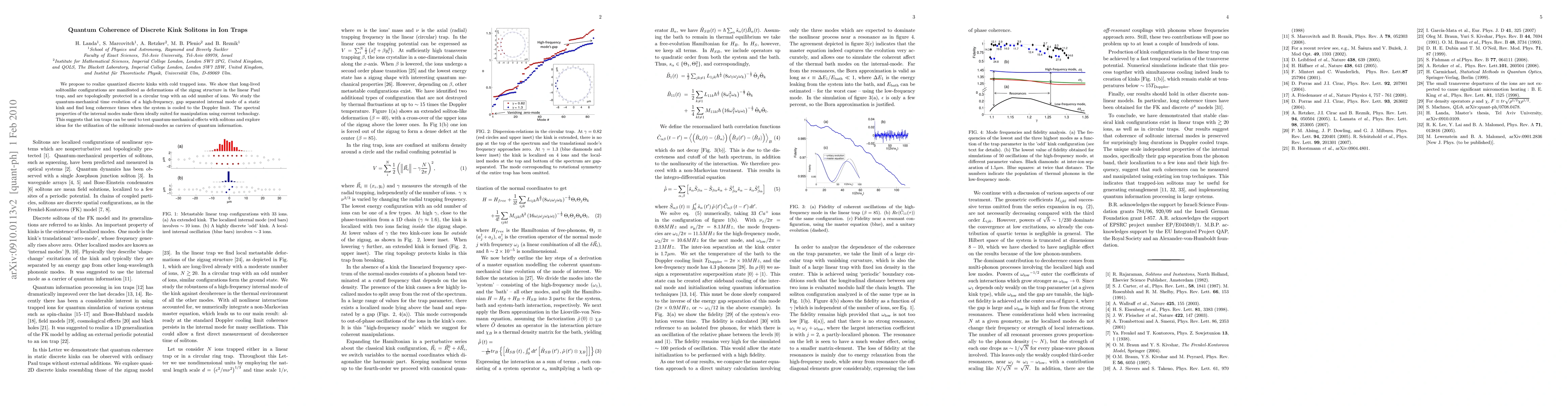 The research proposes using cold trapped ions to create quantized discrete kinks, demonstrating their long-lived, topologically protected nature in specific ion trap configurations. Quantum-mechanical internal mode analysis reveals long coherence times at low temperatures, suggesting potential for ion trap usage in testing quantum effects and as carriers of quantum information.