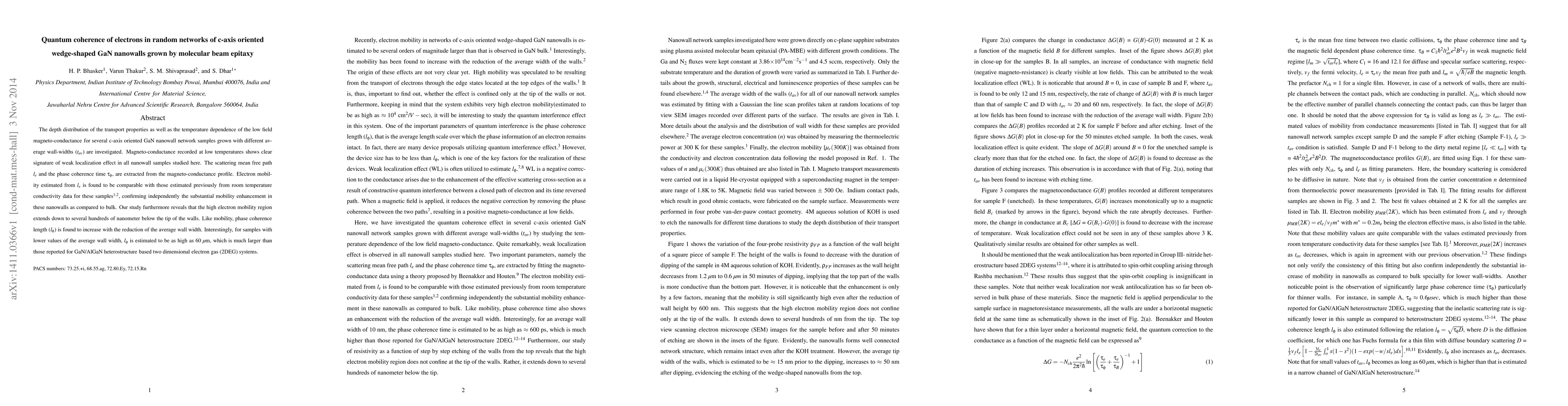 The depth distribution of the transport properties as well as the temperature dependence of the low field magneto-conductance for several c-axis oriented GaN nanowall network samples grown with different average wall-widths are investigated. Magneto-conductance recorded at low temperatures shows clear signature of weak localization effect in all nanowall samples studied here. The scattering mean free path and the phase coherence time, are extracted from the magneto-conductance profile. Electron mobility estimated from scattering mean free path is found to be comparable with those estimated previously from room temperature conductivity data for these samples [Appl. Phys. Lett. 101, 132109 (2012); AIP Conf. Proc. 1583, 252 (2014)], confirming independently the substantial mobility enhancement in these nanowalls as compared to bulk. Our study furthermore reveals that the high electron mobility region extends down to several hundreds of nanometer below the tip of the walls. Like mobility, phase coherence length is found to increase with the reduction of the average wall width. Interestingly, for samples with lower values of the average wall width, phase coherence length is estimated to be as high as 60 micron, which is much larger than those reported for GaN/AlGaN heterostructure based two dimensional electron gas (2DEG) systems.