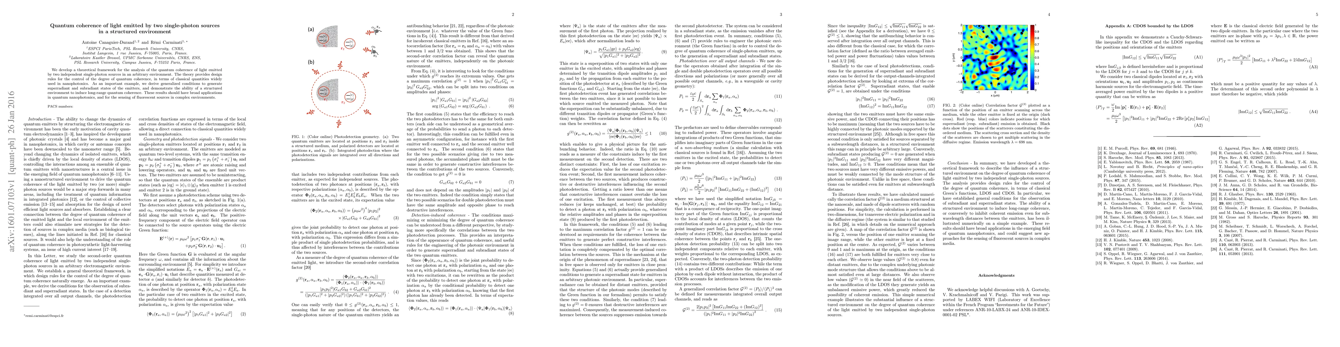 This paper develops a theoretical framework to control quantum coherence in light emitted by two single-photon sources in an environment, enabling the creation of superradiant and subradiant states and sensing fluorescent sources.