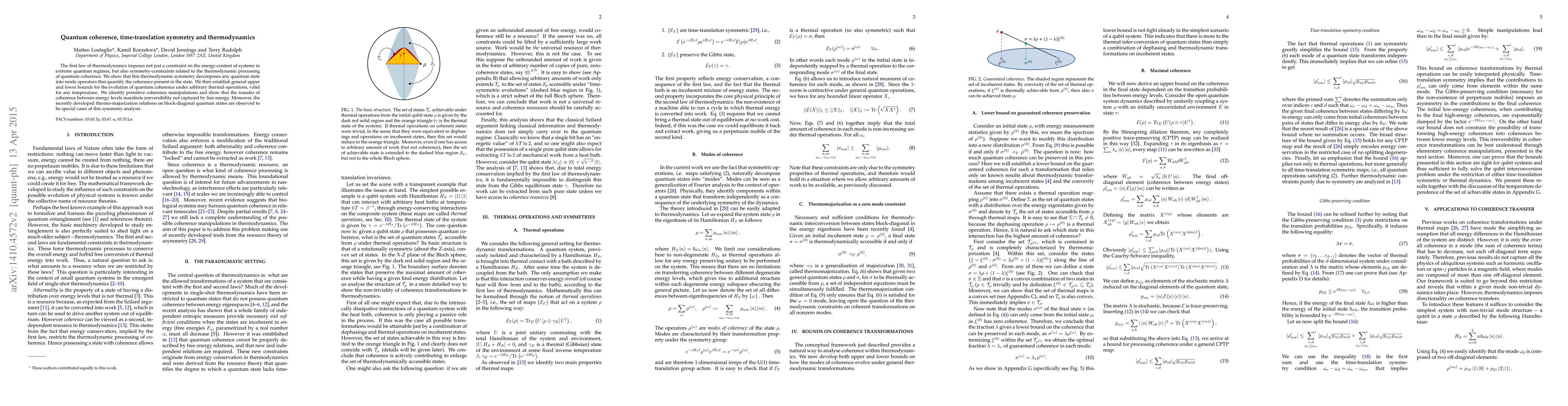 This paper explores the thermodynamic implications of quantum coherence, revealing how the first law of thermodynamics imposes constraints on quantum states and thermal operations. It establishes bounds for quantum coherence evolution and identifies coherence transfer as a source of irreversibility beyond free energy.