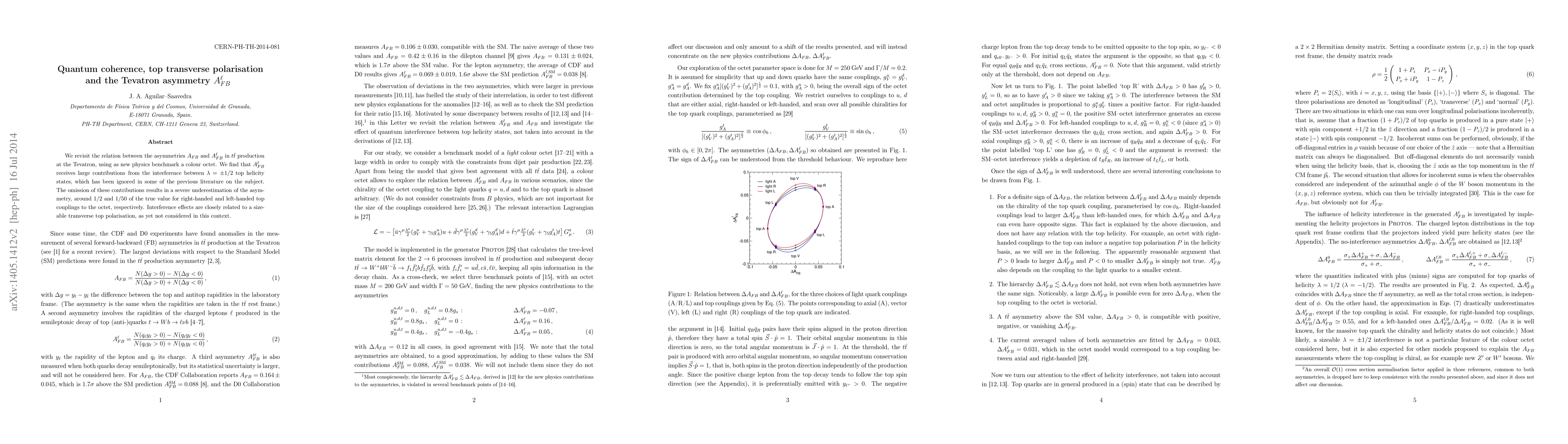 We revisit the relation between the asymmetries $A_{FB}$ and $A_{FB}^\ell$ in $t \bar t$ production at the Tevatron, using as new physics benchmark a colour octet. We find that $A_{FB}^\ell$ receives large contributions from the interference between $\lambda = \pm 1/2$ top helicity states, which has been ignored in some of the previous literature on the subject. The omission of these contributions results in a severe underestimation of the asymmetry, around $1/2$ and $1/50$ of the true value for right-handed and left-handed top couplings to the octet, respectively. Interference effects are closely related to a $\mathcal{O}(1)$ transverse top polarisation, as yet not considered in this context.