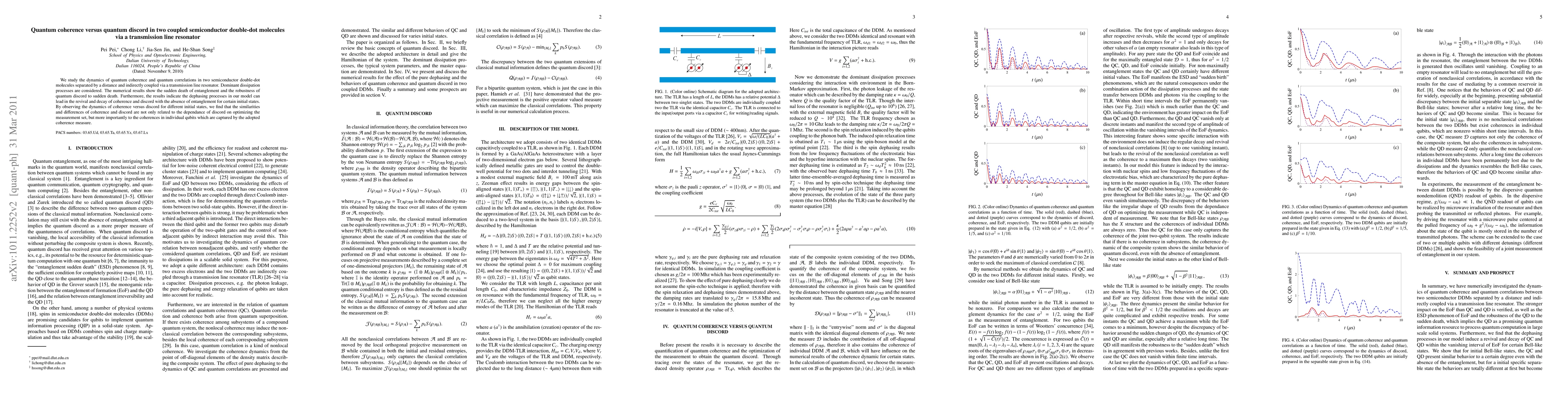 This paper investigates the dynamics of quantum coherence and quantum discord in two coupled semiconductor double-dot molecules mediated by a transmission line resonator, revealing the sudden death of entanglement and the resilience of quantum discord. The study highlights that dephasing processes can lead to the revival and decay of coherence and discord, with entanglement absent for certain initial states, emphasizing the role of individual qubit coherences in the adopted coherence measure.
