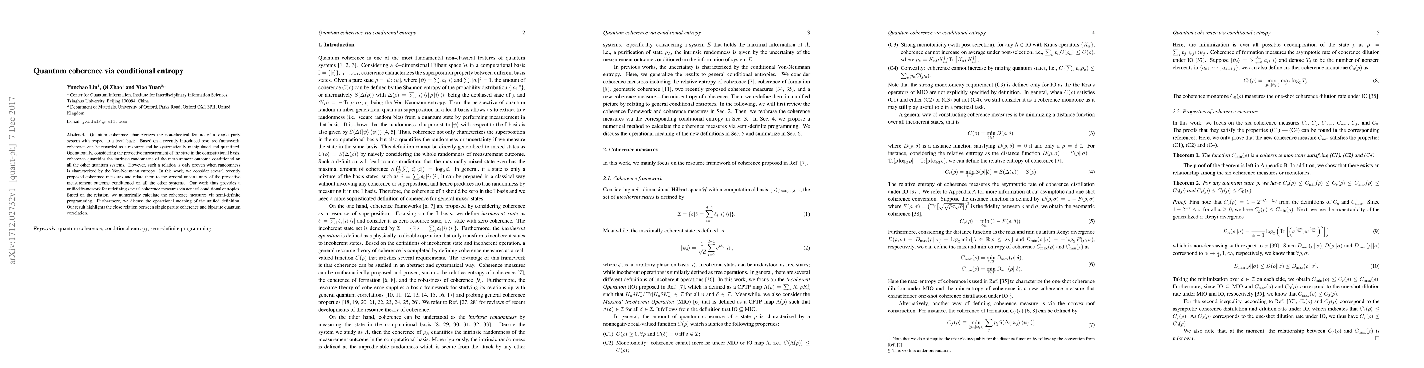 This paper redefines quantum coherence measures using general conditional entropies, providing a unified framework for quantifying coherence based on the intrinsic randomness of projective measurement outcomes conditioned on other systems. The study also numerically calculates these measures using semi-definite programming and discusses their operational significance in relation to bipartite quantum correlations.