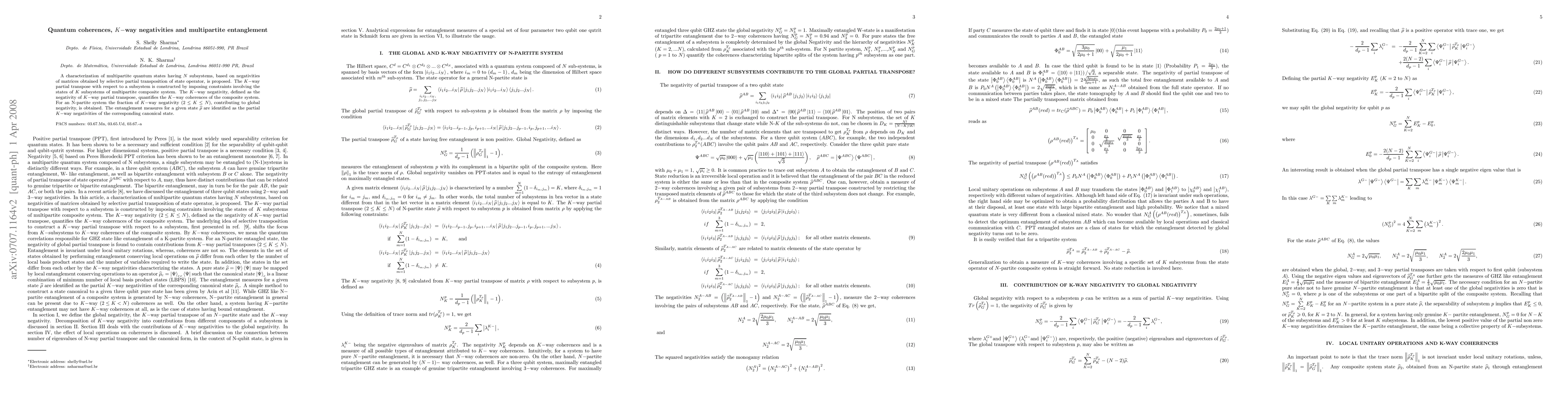 This paper proposes a new characterization of N-partite quantum states using K-way negativities, focusing on K-way coherences rather than subsystems. It identifies entanglement measures as partial K-way negativities of the canonical state.