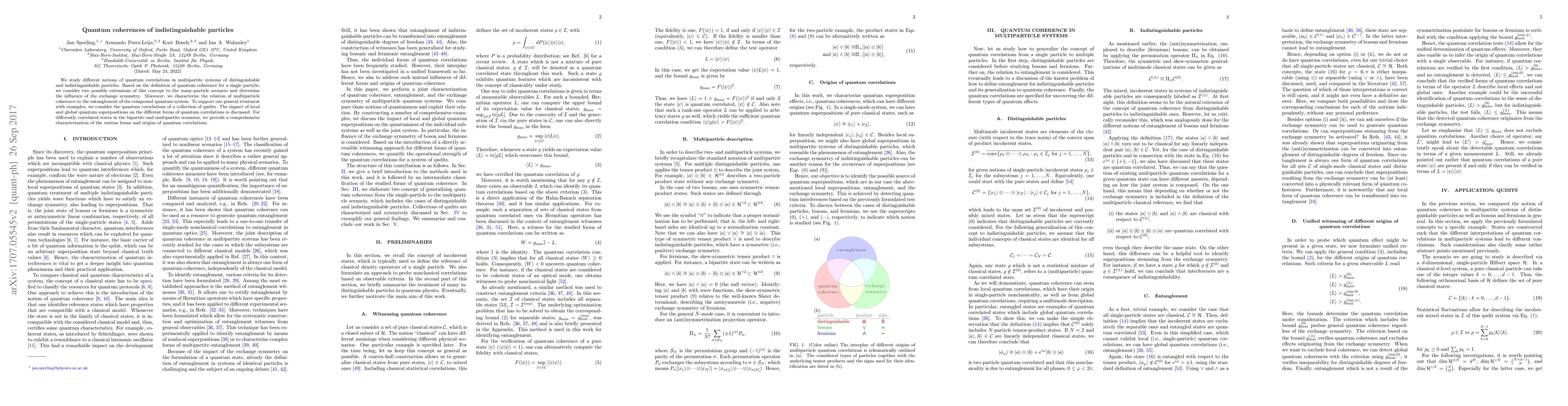 This paper explores quantum coherence in multipartite systems of both distinguishable and indistinguishable particles, proposing two extensions of single-particle coherence to many-particle scenarios. It examines the influence of exchange symmetry and the relationship between multiparticle coherence and entanglement, providing examples with qudits to illustrate the impact of quantum superpositions on these correlations.