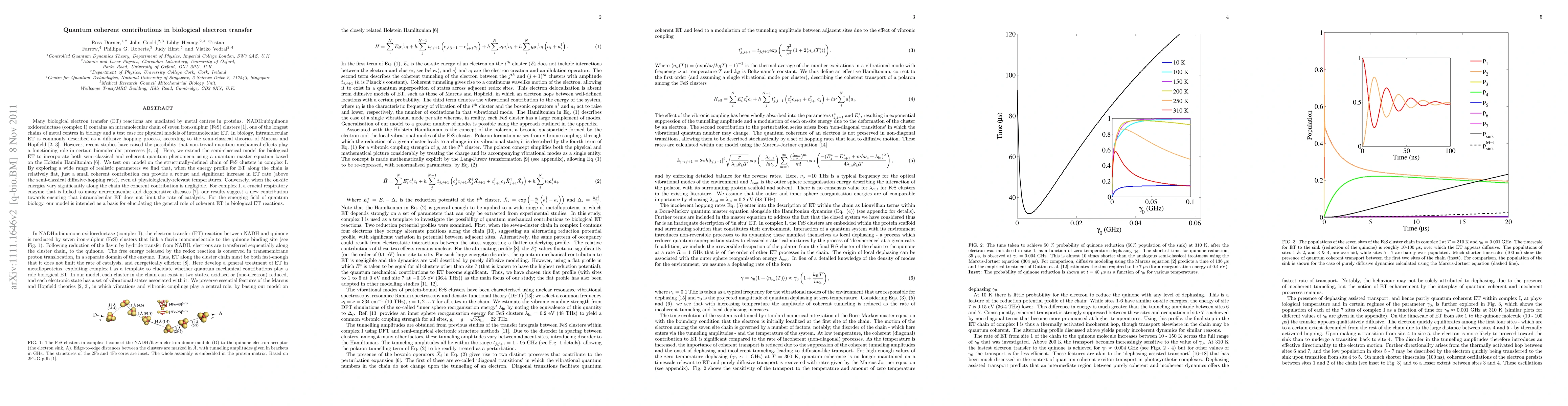 Many biological electron transfer (ET) reactions are mediated by metal centres in proteins. NADH:ubiquinone oxidoreductase (complex I) contains an intramolecular chain of seven iron-sulphur (FeS) clusters, one of the longest chains of metal centres in biology and a test case for physical models of intramolecular ET. In biology, intramolecular ET is commonly described as a diffusive hopping process, according to the semi-classical theories of Marcus and Hopfield. However, recent studies have raised the possibility that non-trivial quantum mechanical effects play a functioning role in certain biomolecular processes. Here, we extend the semi-classical model for biological ET to incorporate both semi-classical and coherent quantum phenomena using a quantum master equation based on the Holstein Hamiltonian. We test our model on the structurally-defined chain of FeS clusters in complex I. By exploring a wide range of realistic parameters we find that, when the energy profile for ET along the chain is relatively flat, just a small coherent contribution can provide a robust and significant increase in ET rate (above the semi-classical diffusive-hopping rate), even at physiologically-relevant temperatures. Conversely, when the on-site energies vary significantly along the chain the coherent contribution is negligible. For complex I, a crucial respiratory enzyme that is linked to many neuromuscular and degenerative diseases, our results suggest a new contribution towards ensuring that intramolecular ET does not limit the rate of catalysis. For the emerging field of quantum biology, our model is intended as a basis for elucidating the general role of coherent ET in biological ET reactions.