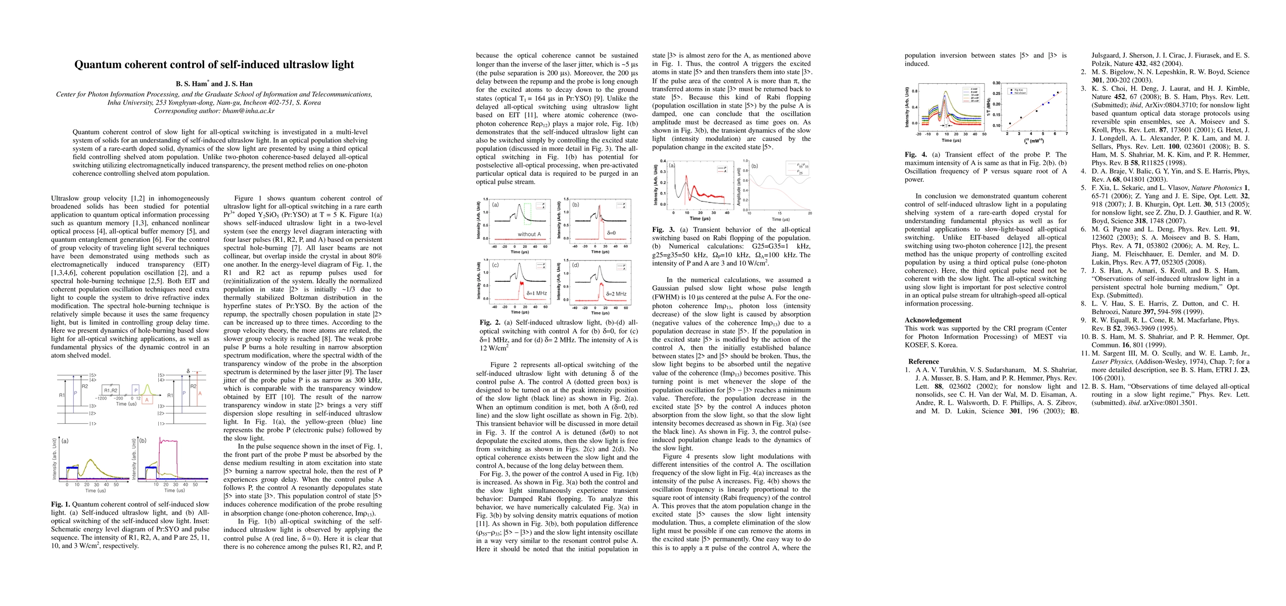 Quantum coherent control of slow light for all-optical switching is investigated in a multi-level system of solids for an understanding of self-induced ultraslow light. In an optical population shelving system of a rare-earth doped solid, dynamics of the slow light are presented by using a third optical field controlling shelved atom population. Unlike two-photon coherence-based delayed all-optical switching utilizing electromagnetically induced transparency, the present method relies on one-photon coherence controlling shelved atom population.
