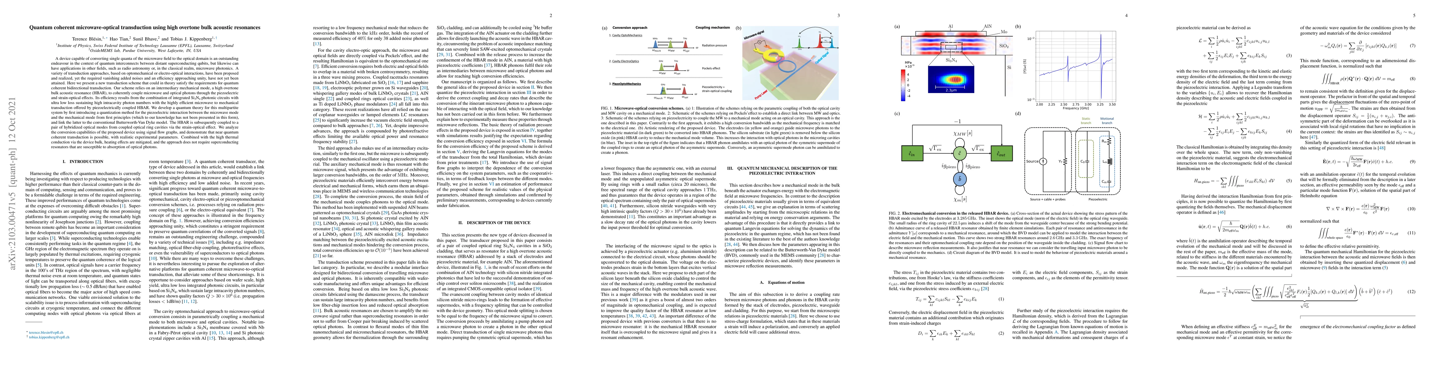 This paper proposes a novel transduction scheme using high overtone bulk acoustic resonances (HBAR) to achieve quantum coherent microwave-to-optical conversion. The scheme integrates Si3N4 photonic circuits with piezoelectric and strain-optical effects, aiming for high efficiency and minimal added noise, potentially enabling quantum interconnects and applications in radio astronomy.