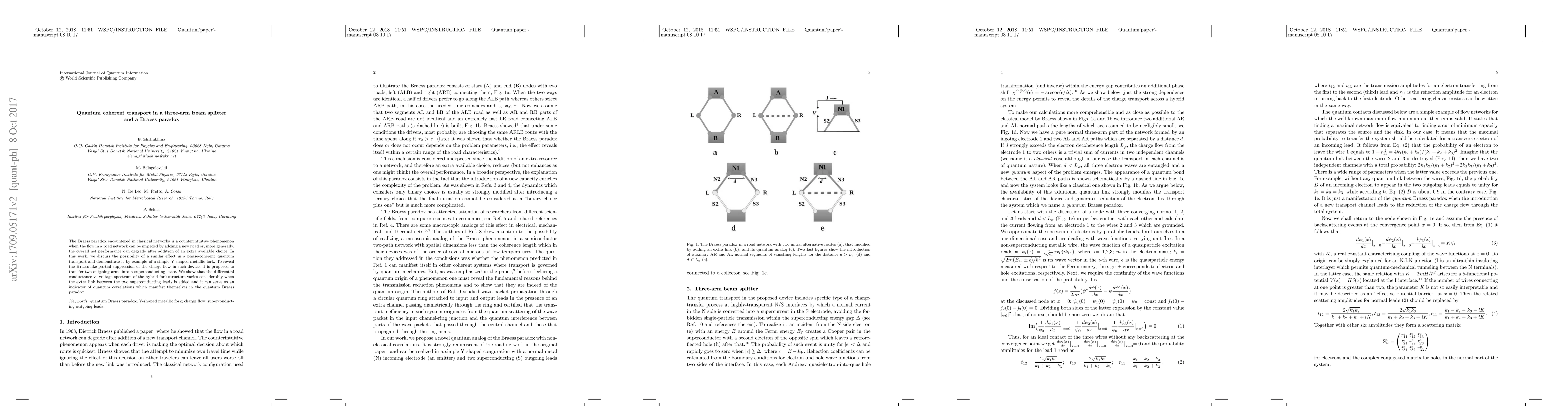 This paper explores the Braess paradox in quantum coherent transport through a Y-shaped metallic fork, demonstrating that adding an extra superconducting link can paradoxically suppress charge flow. The study reveals the quantum Braess paradox through changes in the differential conductance-vs-voltage spectrum.