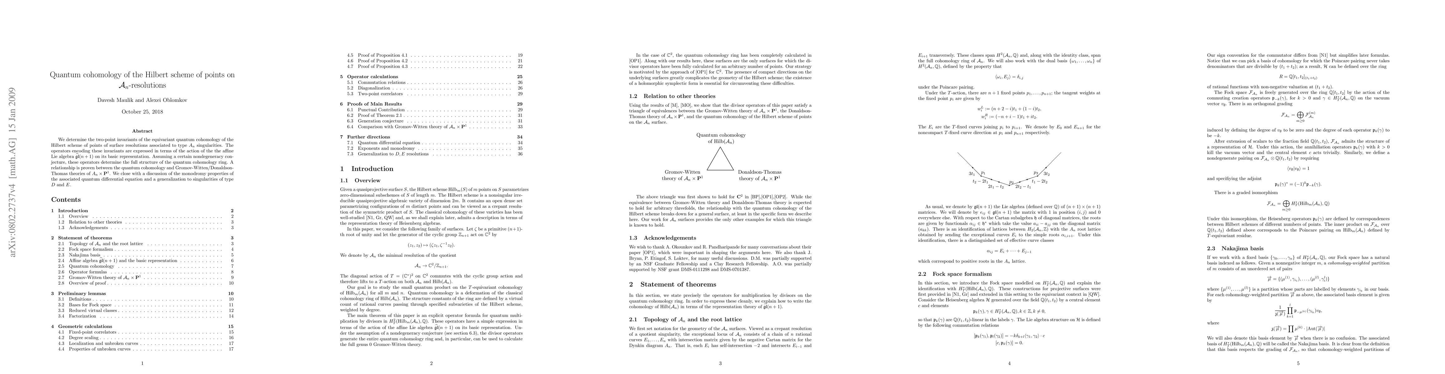 We determine the two-point invariants of the equivariant quantum cohomology of the Hilbert scheme of points of surface resolutions associated to type A_n singularities. The operators encoding these invariants are expressed in terms of the action of the affine Lie algebra \hat{gl}(n+1) on its basic representation. Assuming a certain nondegeneracy conjecture, these operators determine the full structure of the quantum cohomology ring. A relationship is proven between the quantum cohomology and Gromov-Witten/Donaldson-Thomas theories of A_n x P^1. We close with a discussion of the monodromy properties of the associated quantum differential equation and a generalization to singularities of type D and E.