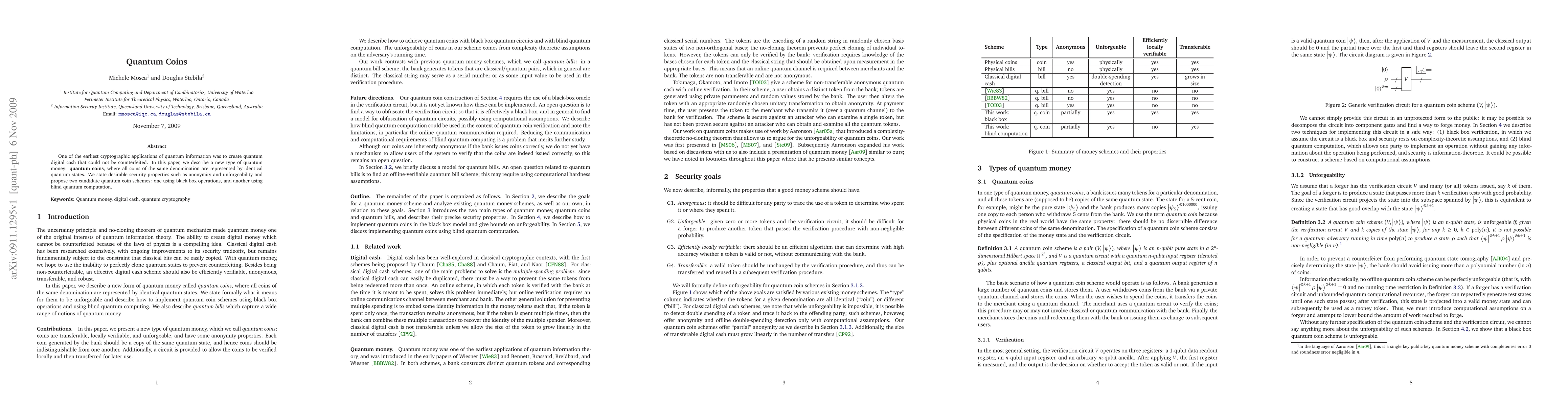 This paper introduces a novel concept of quantum coins, where identical quantum states represent all coins of the same denomination, ensuring anonymity and unforgeability. It proposes two quantum coin schemes: one utilizing black box operations and another employing blind quantum computation.