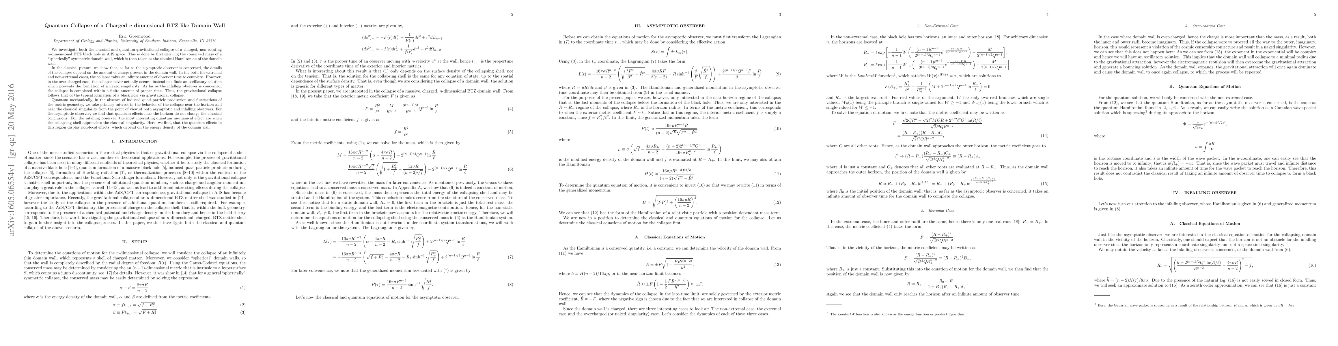 We investigate both the classical and quantum gravitational collapse of a charged, non-rotating $n$-dimensional BTZ black hole in AdS space. This is done by first deriving the conserved mass of a "spherically" symmetric domain wall, which is then taken as the classical Hamiltonian of the domain wall. In the classical picture, we show that, as far as the asymptotic observer is concerned, the details of the collapse depend on the amount of charge present in the domain wall. In the both the extremal and non-extremal cases, the collapse takes an infinite amount of observer time to complete. However, in the over-charged case, the collapse never actually occurs, instead one finds an oscillatory solution which prevents the formation of a naked singularity. As far as the infalling observer is concerned, the collapse is completed within a finite amount of proper time. Thus, the gravitational collapse follows that of the typical formation of a black hole via gravitational collapse. Quantum mechanically, in the absence of induced quasi-particle production and fluctuations of the metric geometry, we take primary interest in the behavior of the collapse near the horizon and near the classical singularity from the point of view of both asymptotic and infalling observers. For the asymptotic observer, we find that quantum effects near the horizon do not change the classical conclusions. For the infalling observer, the most interesting quantum mechanical effect are when the collapsing shell approaches the classical singularity. Here, we find, that the quantum effects in this region display non-local effects, which depend on the energy density of the domain wall.