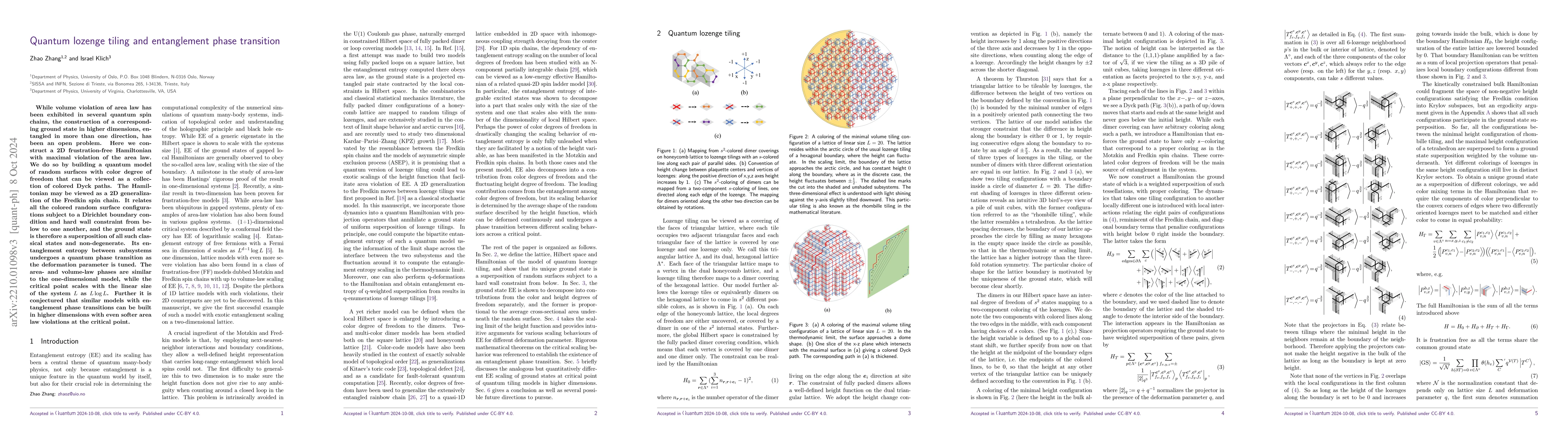 This paper constructs a 2D quantum model with maximal violation of the area law, featuring a frustration-free Hamiltonian based on colored lozenge tiling. The model exhibits an entanglement phase transition as a parameter is tuned, with critical behavior scaling as $L\log L$.
