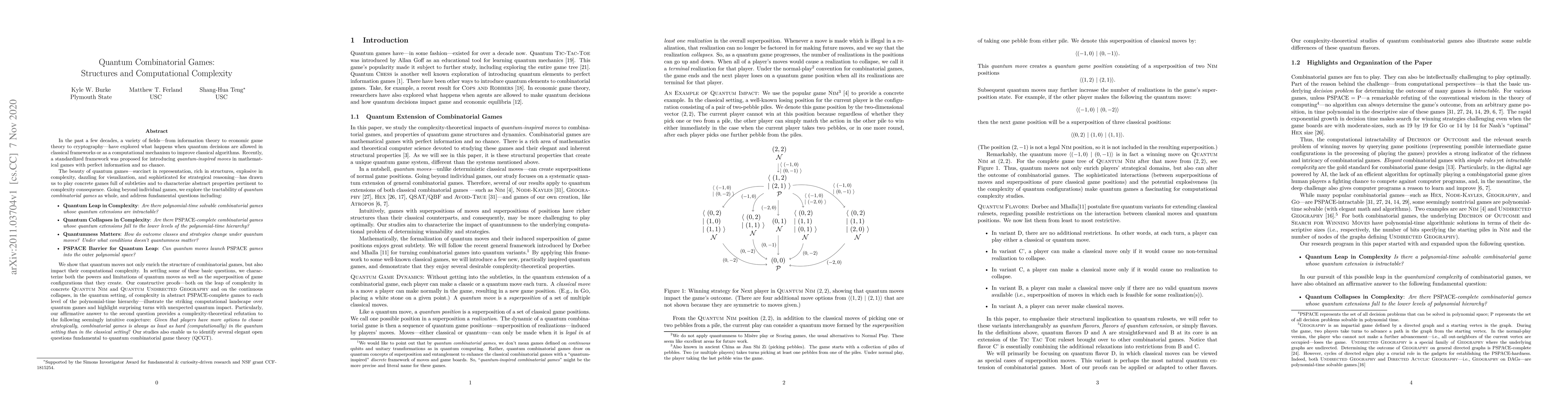 Recently, a standardized framework was proposed for introducing quantum-inspired moves in mathematical games with perfect information and no chance. The beauty of quantum games-succinct in representation, rich in structures, explosive in complexity, dazzling for visualization, and sophisticated for strategic reasoning-has drawn us to play concrete games full of subtleties and to characterize abstract properties pertinent to complexity consequence. Going beyond individual games, we explore the tractability of quantum combinatorial games as whole, and address fundamental questions including: Quantum Leap in Complexity: Are there polynomial-time solvable games whose quantum extensions are intractable? Quantum Collapses in Complexity: Are there PSPACE-complete games whose quantum extensions fall to the lower levels of the polynomial-time hierarchy? Quantumness Matters: How do outcome classes and strategies change under quantum moves? Under what conditions doesn't quantumness matter? PSPACE Barrier for Quantum Leap: Can quantum moves launch PSPACE games into outer polynomial space We show that quantum moves not only enrich the game structure, but also impact their computational complexity. In settling some of these basic questions, we characterize both the powers and limitations of quantum moves as well as the superposition of game configurations that they create. Our constructive proofs-both on the leap of complexity in concrete Quantum Nim and Quantum Undirected Geography and on the continuous collapses, in the quantum setting, of complexity in abstract PSPACE-complete games to each level of the polynomial-time hierarchy-illustrate the striking computational landscape over quantum games and highlight surprising turns with unexpected quantum impact. Our studies also enable us to identify several elegant open questions fundamental to quantum combinatorial game theory (QCGT).