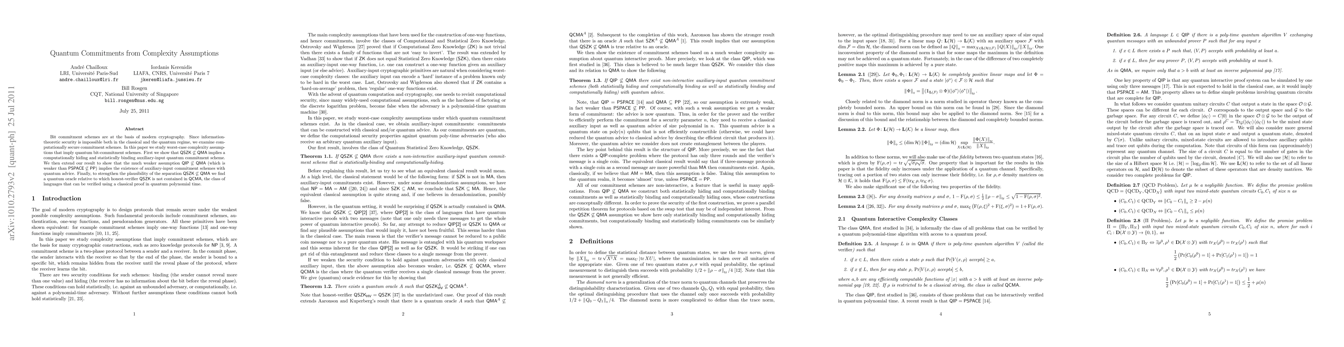 Bit commitment schemes are at the basis of modern cryptography. Since information-theoretic security is impossible both in the classical and the quantum regime, we need to look at computationally secure commitment schemes. In this paper, we study worst-case complexity assumptions that imply quantum bit-commitment schemes. First, we show that QSZK not included in QMA implies a computationally hiding and statistically binding auxiliary-input quantum commitment scheme. Additionally, we give auxiliary-input commitment schemes using quantum advice that depend on the much weaker assumption that QIP is not included in QMA (which is weaker than PSPACE not included in PP). Finally, we find a quantum oracle relative to which honest-verifier QSZK is not contained in QCMA, the class of languages that can be verified using a classical proof in quantum polynomial time.