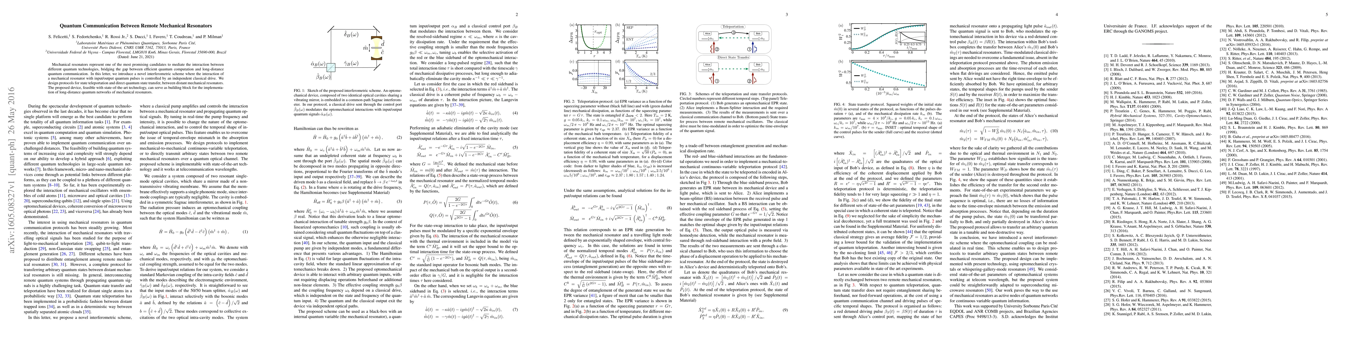 This paper proposes a novel interferometric scheme for quantum communication between remote mechanical resonators using classical drive control, enabling state teleportation and direct quantum state transfer. The designed protocols are feasible with current technology and could serve as a foundational component for long-distance quantum networks.