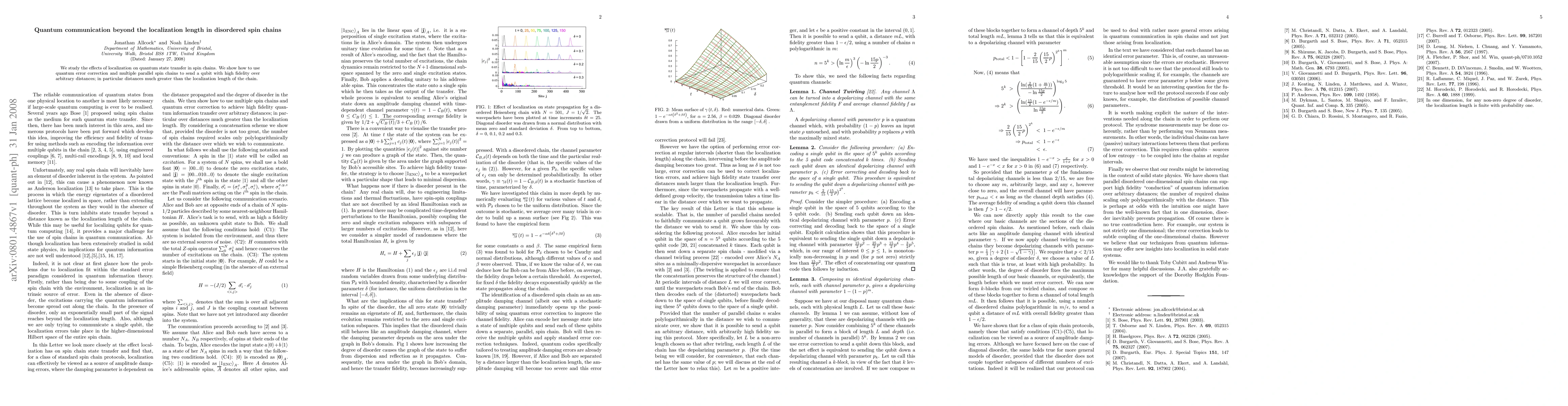 Summary: This paper explores overcoming localization effects in quantum state transfer through spin chains, demonstrating the use of quantum error correction and parallel spin chains to achieve high-fidelity qubit transmission over distances far exceeding the chain's localization length.
