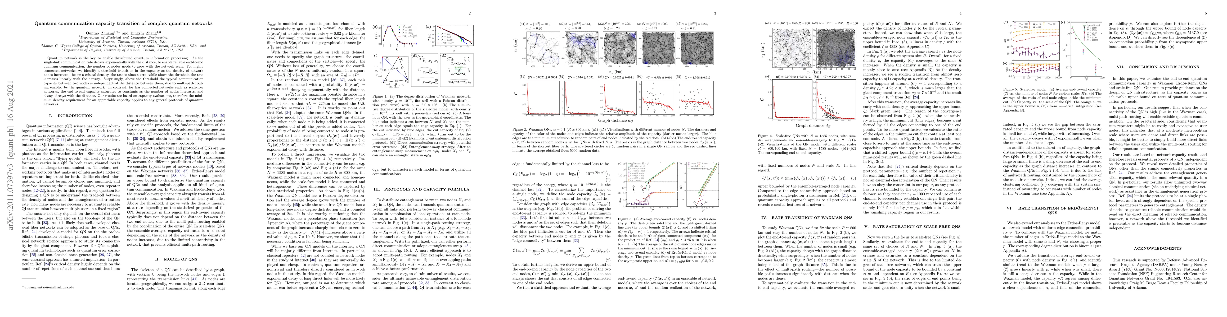 Quantum network is the key to enable distributed quantum information processing. As the single-link communication rate decays exponentially with the distance, to enable reliable end-to-end quantum communication, the number of nodes needs to grow with the network scale. For highly connected networks, we identify a threshold transition in the capacity as the density of network nodes increases---below a critical density, the rate is almost zero, while above the threshold the rate increases linearly with the density. Surprisingly, above the threshold the typical communication capacity between two nodes is independent of the distance between them, due to multi-path routing enabled by the quantum network. In contrast, for less connected networks such as scale-free networks, the end-to-end capacity saturates to constants as the number of nodes increases, and always decays with the distance. Our results are based on capacity evaluations, therefore the minimum density requirement for an appreciable capacity applies to any general protocols of quantum networks.