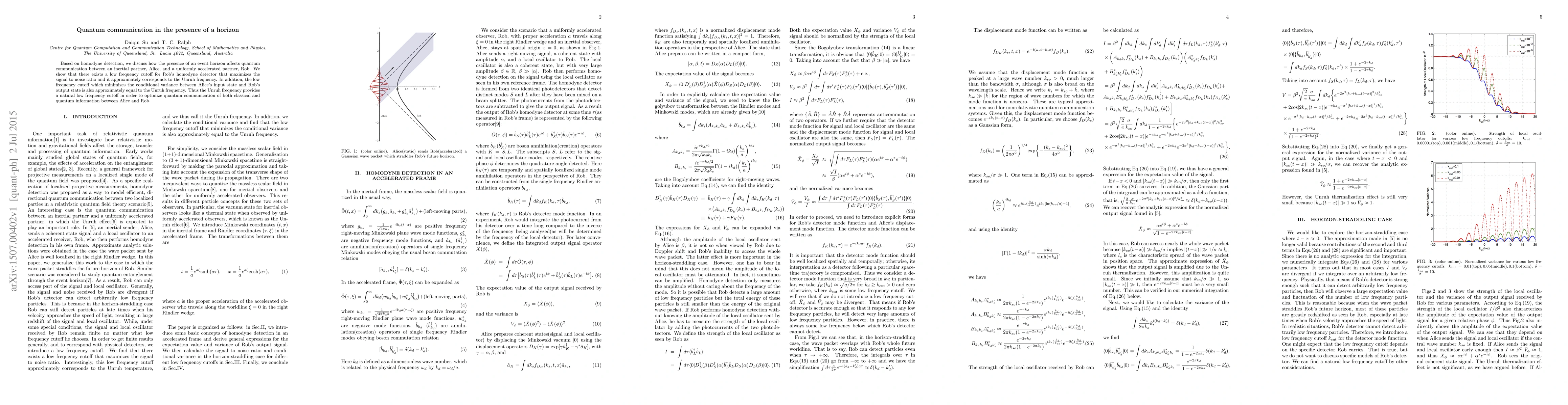 Based on homodyne detection, we discuss how the presence of an event horizon affects quantum communication between an inertial partner, Alice, and a uniformly accelerated partner, Rob. We show that there exists a low frequency cutoff for Rob's homodyne detector that maximizes the signal to noise ratio and it approximately corresponds to the Unruh frequency. In addition, the low frequency cutoff which minimizes the conditional variance between Alice's input state and Rob's output state is also approximately equal to the Unruh frequency. Thus the Unruh frequency provides a natural low frequency cutoff in order to optimize quantum communication of both classical and quantum information between Alice and Rob.