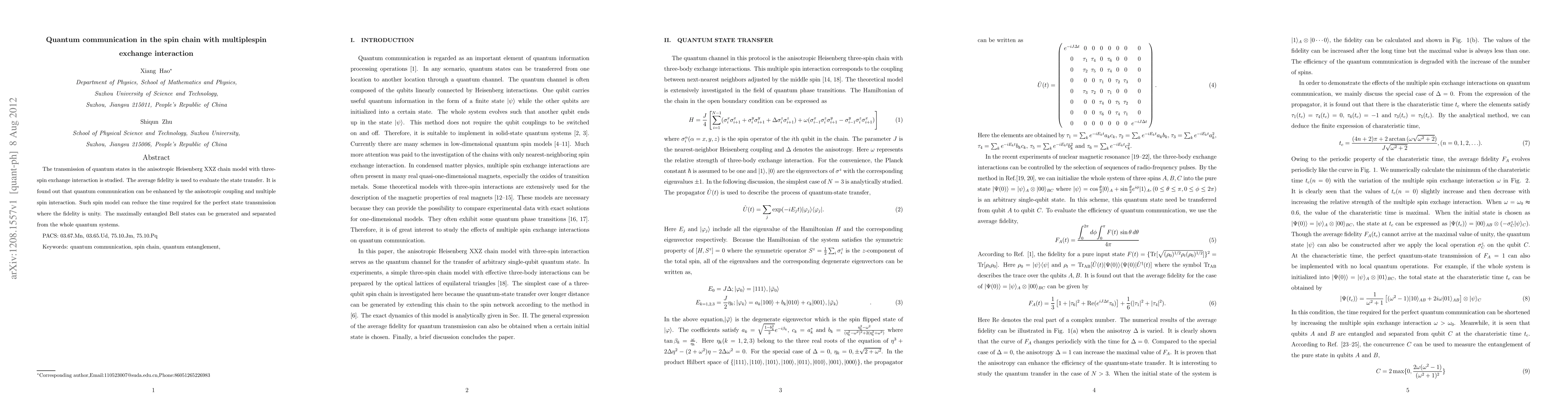 The transmission of quantum states in the anisotropic Heisenberg XXZ chain model with three-spin exchange interaction is studied. The average fidelity is used to evaluate the state transfer. It is found out that quantum communication can be enhanced by the anisotropic coupling and multiple spin interaction. Such spin model can reduce the time required for the perfect state transmission where the fidelity is unity. The maximally entangled Bell states can be generated and separated from the whole quantum systems.