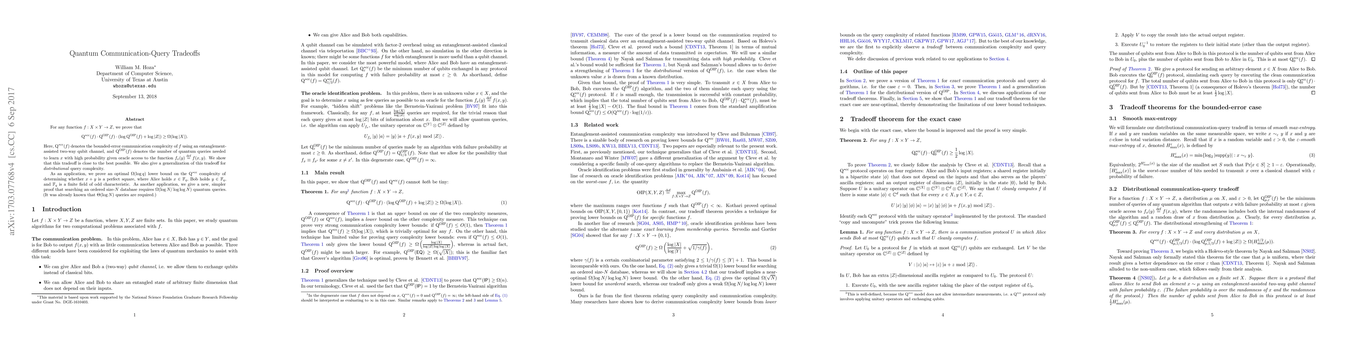 For any function $f: X \times Y \to Z$, we prove that $Q^{*\text{cc}}(f) \cdot Q^{\text{OIP}}(f) \cdot (\log Q^{\text{OIP}}(f) + \log |Z|) \geq \Omega(\log |X|)$. Here, $Q^{*\text{cc}}(f)$ denotes the bounded-error communication complexity of $f$ using an entanglement-assisted two-way qubit channel, and $Q^{\text{OIP}}(f)$ denotes the number of quantum queries needed to learn $x$ with high probability given oracle access to the function $f_x(y) \stackrel{\text{def}}{=} f(x, y)$. We show that this tradeoff is close to the best possible. We also give a generalization of this tradeoff for distributional query complexity. As an application, we prove an optimal $\Omega(\log q)$ lower bound on the $Q^{*\text{cc}}$ complexity of determining whether $x + y$ is a perfect square, where Alice holds $x \in \mathbf{F}_q$, Bob holds $y \in \mathbf{F}_q$, and $\mathbf{F}_q$ is a finite field of odd characteristic. As another application, we give a new, simpler proof that searching an ordered size-$N$ database requires $\Omega(\log N / \log \log N)$ quantum queries. (It was already known that $\Theta(\log N)$ queries are required.)