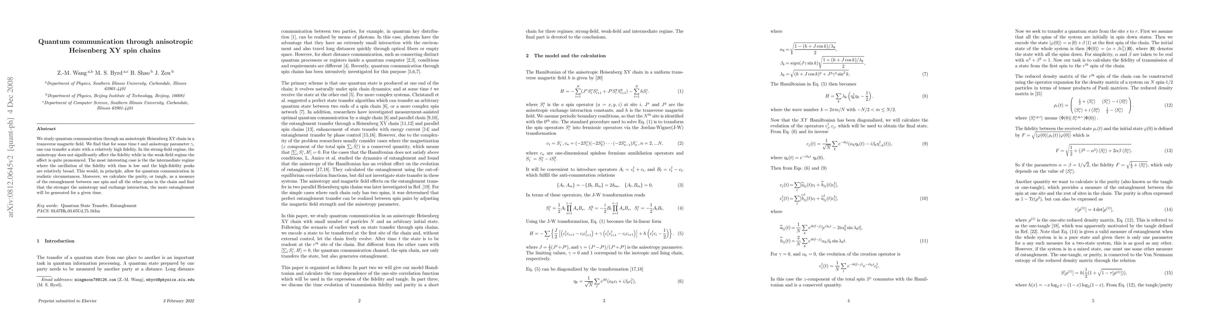 This paper explores quantum communication via anisotropic Heisenberg XY spin chains in a transverse magnetic field, finding that the fidelity of state transfer is high in intermediate regimes. The study shows that stronger anisotropy and exchange interactions generate more entanglement, suggesting potential for practical quantum communication.