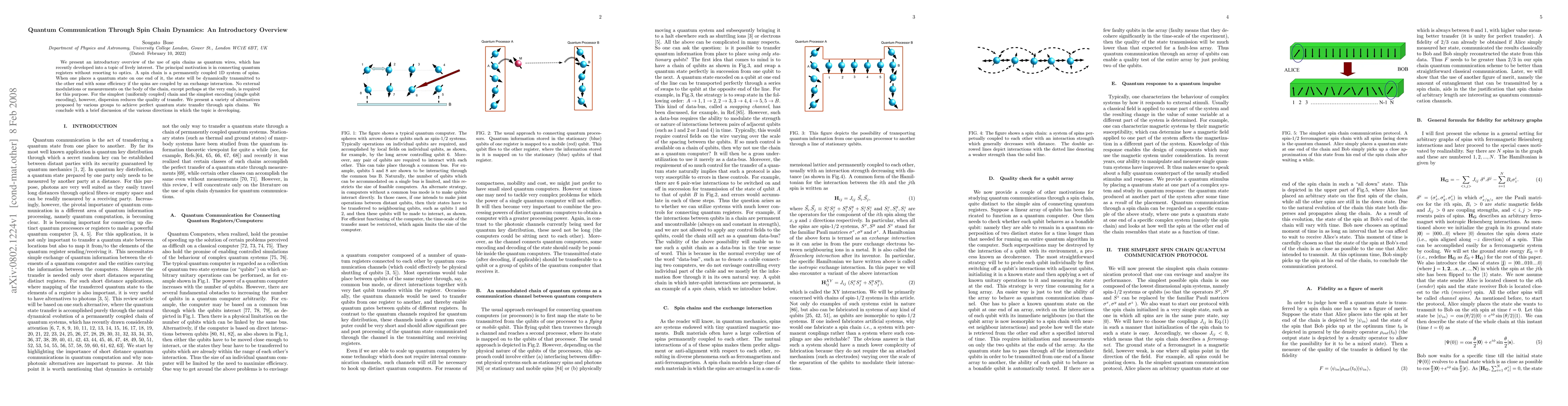 This paper provides an introductory overview of using spin chains as quantum wires for transmitting quantum states without optical methods. It discusses various strategies to overcome dispersion issues and achieve perfect quantum state transfer, highlighting the ongoing developments in this field.