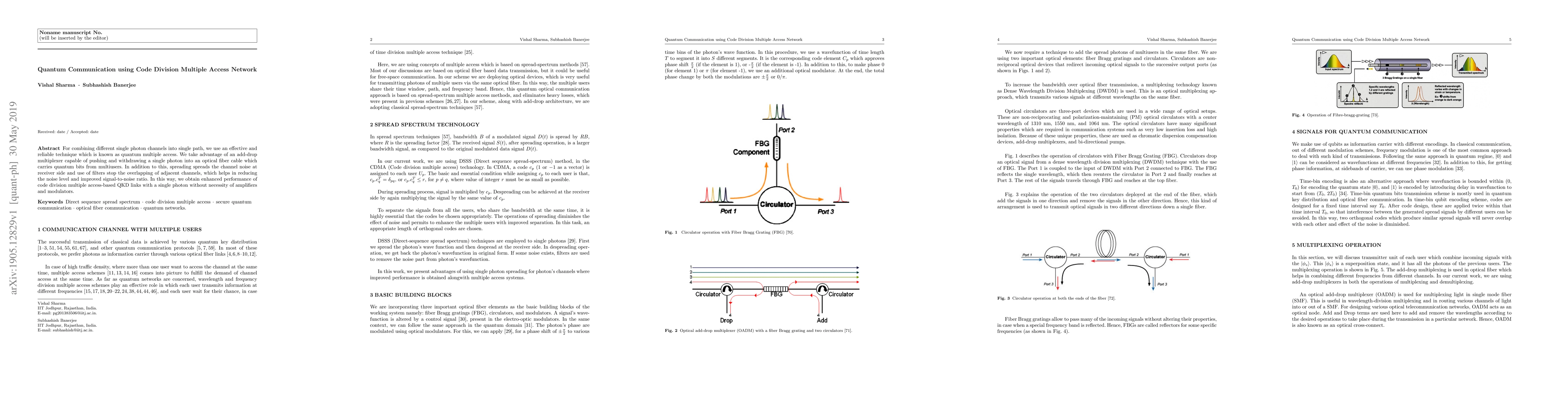 This paper proposes a quantum communication method using code division multiple access (CDMA) that combines single photon channels into a single path via an add-drop multiplexer. The technique reduces noise and improves signal-to-noise ratio without the need for amplifiers or modulators.