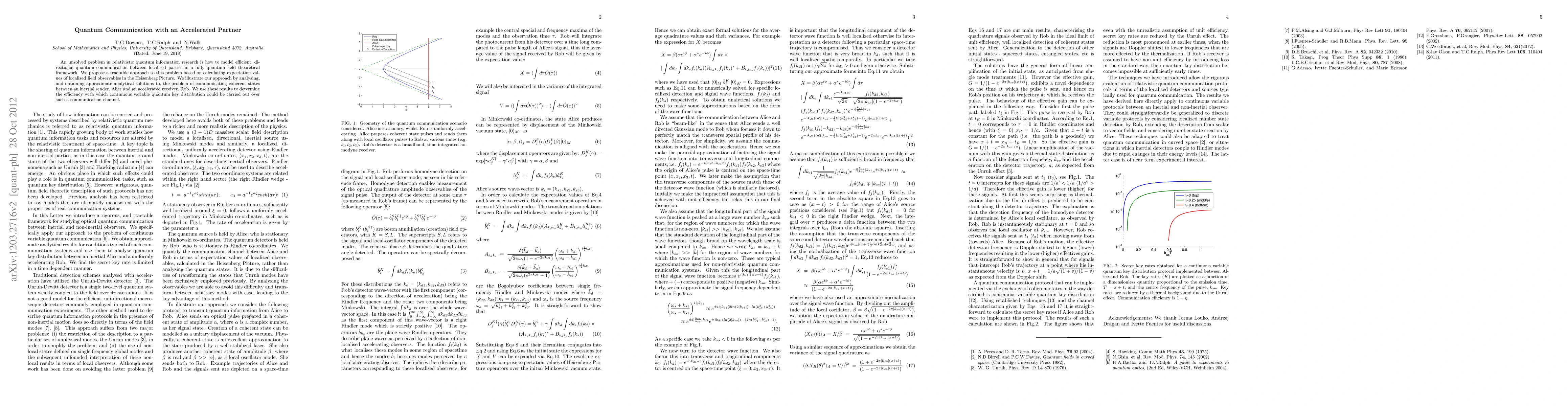 An unsolved problem in relativistic quantum information research is how to model efficient, directional quantum communication between localised parties in a fully quantum field theoretical framework. We propose a tractable approach to this problem based on solving the Heisenberg evolution of localized field observables. We illustrate our approach by analysing, and obtaining approximate analytical solutions to, the problem of communicating coherent states between an inertial sender, Alice and an accelerated receiver, Rob. We use these results to determine the efficiency with which continuous variable quantum key distribution could be carried out over such a communication channel.