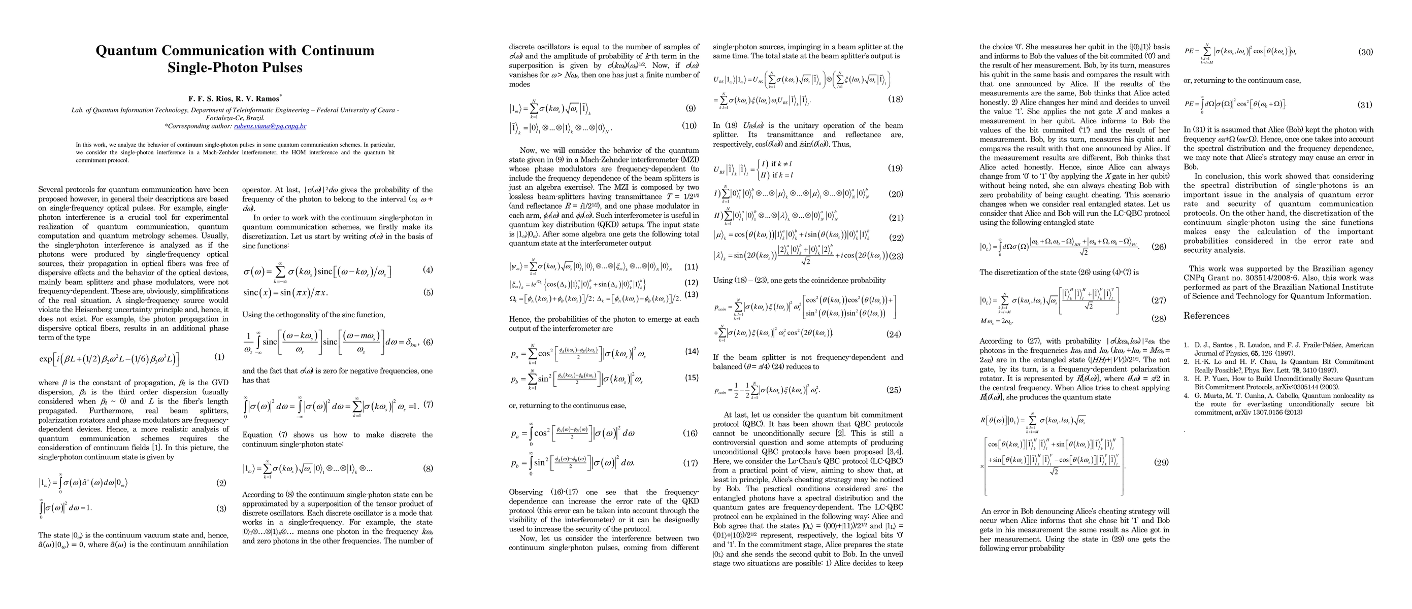 In this work, we analyze the behavior of continuum single-photon pulses in some quantum communication schemes. In particular, we consider the single-photon interference in a Mach-Zenhder interferometer, the HOM interference and the quantum bit commitment protocol.