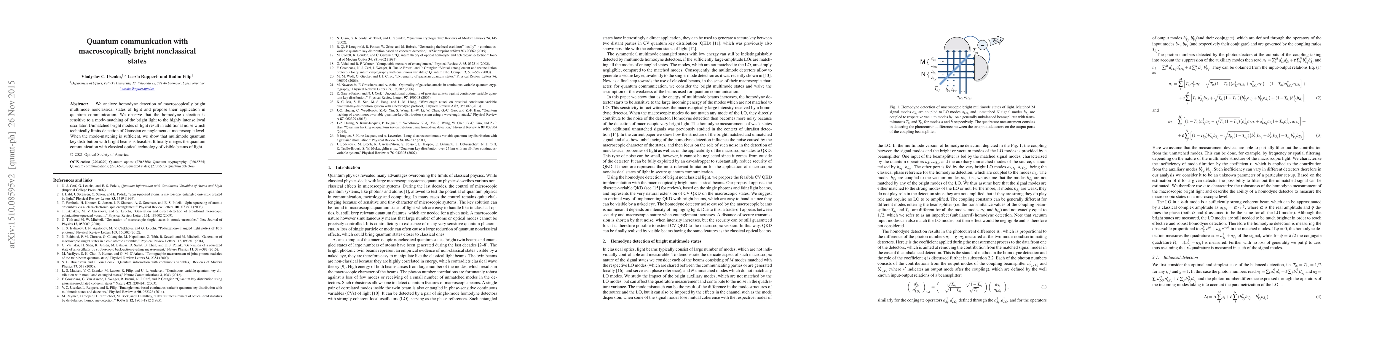 We analyze homodyne detection of macroscopically bright multimode nonclassical states of light and propose their application in quantum communication. We observe that the homodyne detection is sensitive to a mode-matching of the bright light to the highly intense local oscillator. Unmatched bright modes of light result in additional noise which technically limits detection of Gaussian entanglement at macroscopic level. When the mode-matching is sufficient, we show that multimode quantum key distribution with bright beams is feasible. It finally merges the quantum communication with classical optical technology of visible beams of light.