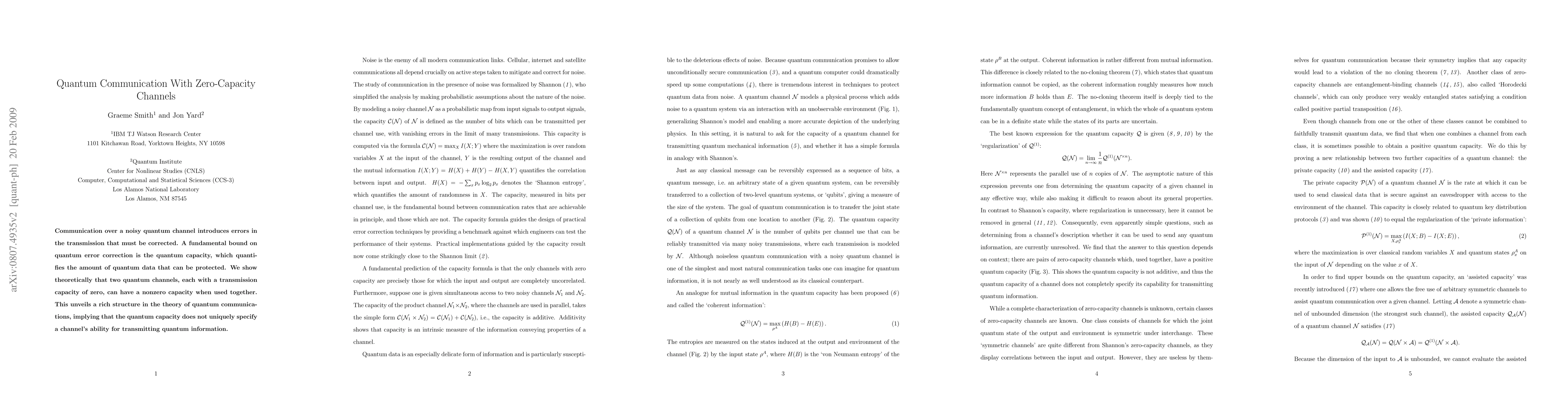 This paper demonstrates that two quantum channels, each having a zero transmission capacity individually, can collectively achieve a nonzero quantum capacity. This finding reveals a complex structure in quantum communication theory, indicating that quantum capacity does not singularly determine a channel's quantum information transmission ability.