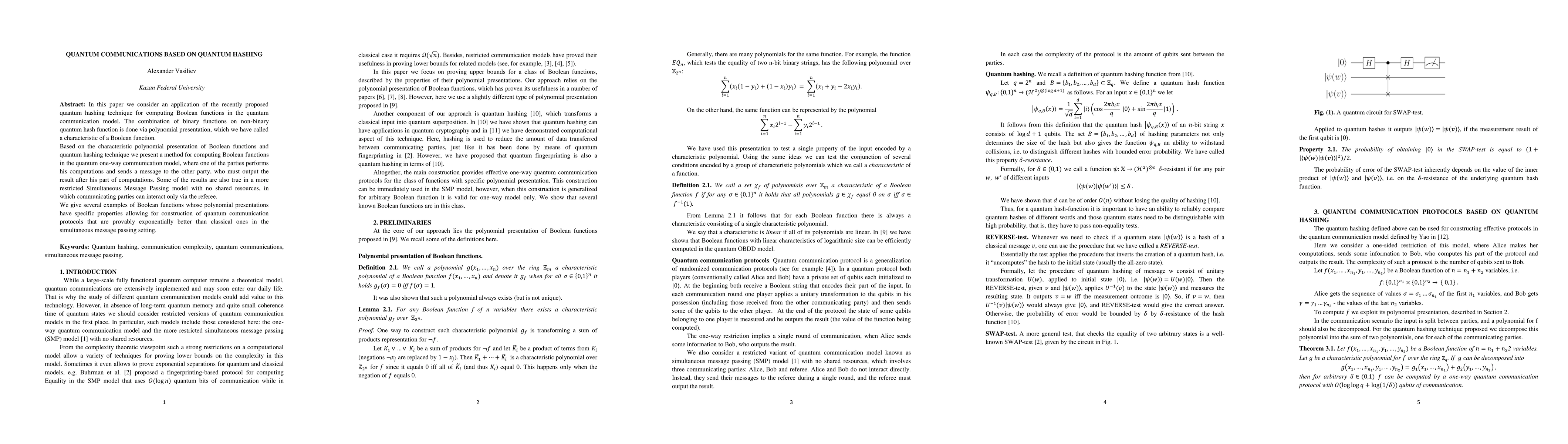 In this paper we consider an application of the recently proposed quantum hashing technique for computing Boolean functions in the quantum communication model. The combination of binary functions on non-binary quantum hash function is done via polynomial presentation, which we have called a characteristic of a Boolean function. Based on the characteristic polynomial presentation of Boolean functions and quantum hashing technique we present a method for computing Boolean functions in the quantum one-way communication model, where one of the parties performs his computations and sends a message to the other party, who must output the result after his part of computations. Some of the results are also true in a more restricted Simultaneous Message Passing model with no shared resources, in which communicating parties can interact only via the referee. We give several examples of Boolean functions whose polynomial presentations have specific properties allowing for construction of quantum communication protocols that are provably exponentially better than classical ones in the simultaneous message passing setting.