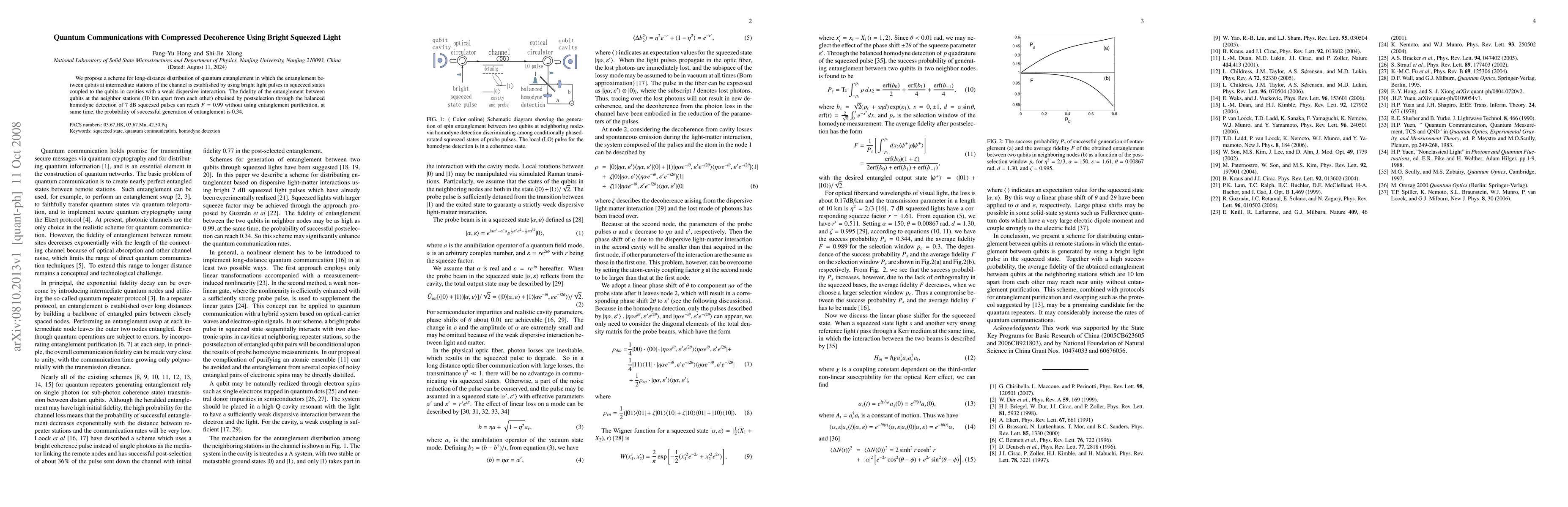We propose a scheme for long-distance distribution of quantum entanglement in which the entanglement between qubits at intermediate stations of the channel is established by using bright light pulses in squeezed states coupled to the qubits in cavities with a weak dispersive interaction. The fidelity of the entanglement between qubits at the neighbor stations (10 km apart from each other) obtained by postselection through the balanced homodyne detection of 7 dB squeezed pulses can reach F=0.99 without using entanglement purification, at same time, the probability of successful generation of entanglement is 0.34.