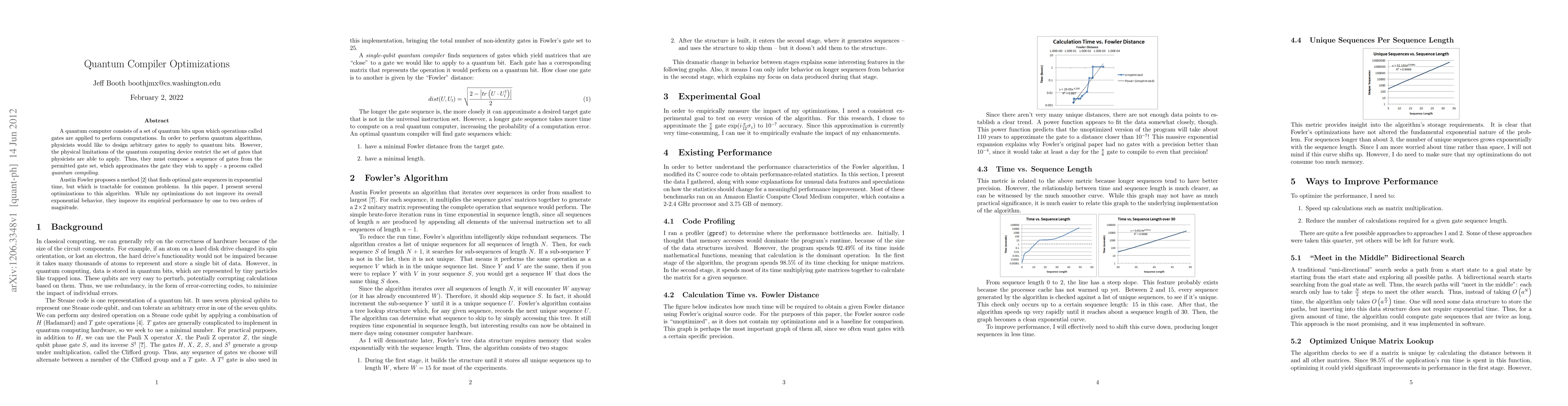 A quantum computer consists of a set of quantum bits upon which operations called gates are applied to perform computations. In order to perform quantum algorithms, physicists would like to design arbitrary gates to apply to quantum bits. However, the physical limitations of the quantum computing device restrict the set of gates that physicists are able to apply. Thus, they must compose a sequence of gates from the permitted gate set, which approximates the gate they wish to apply - a process called quantum compiling. Austin Fowler proposes a method that finds optimal gate sequences in exponential time, but which is tractable for common problems. In this paper, I present several optimizations to this algorithm. While my optimizations do not improve its overall exponential behavior, they improve its empirical performance by one to two orders of magnitude.