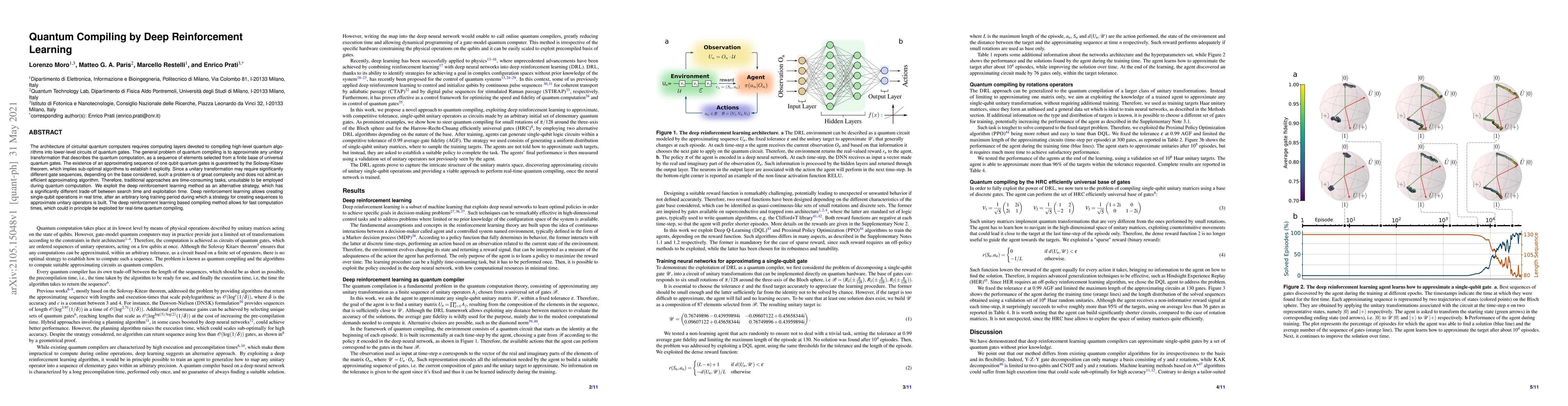 This paper proposes using deep reinforcement learning to efficiently compile high-level quantum algorithms into lower-level quantum gate sequences, addressing the complexity and inefficiency of traditional methods. The approach enables real-time quantum compiling by training a model to generate optimal gate sequences during a long initial training phase.