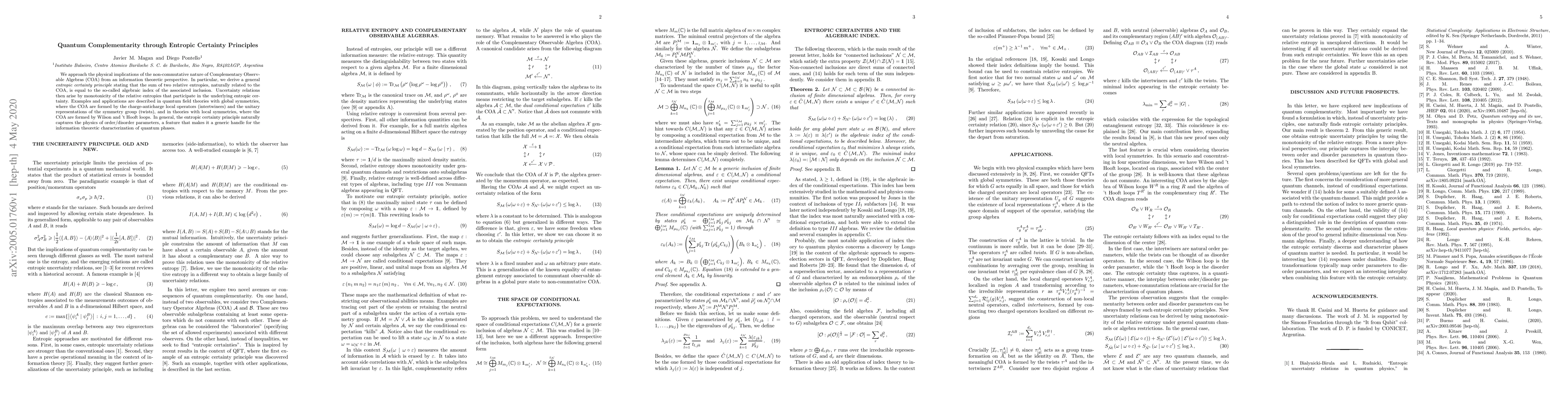 This paper explores the non-commutative nature of Complementary Observable Algebras using information theory, deriving an entropic certainty principle that links relative entropies to the algebraic index of inclusions. The principle provides uncertainty relations and is applied to quantum field theories with global and local symmetries, offering insights into quantum phase characterization.