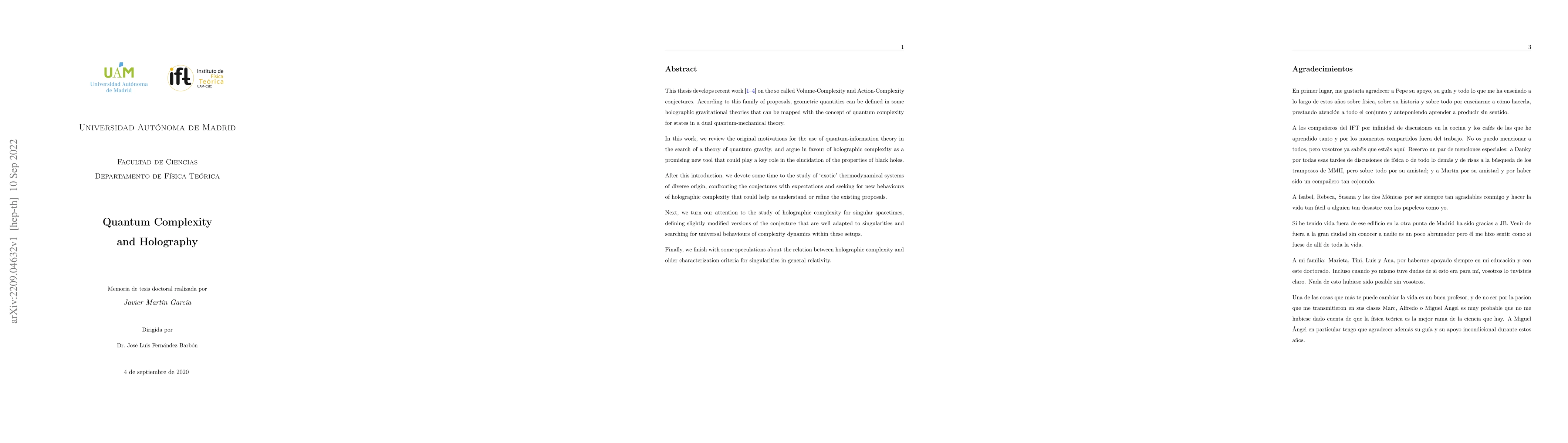 This thesis develops recent work on the so called Volume-Complexity and Action-Complexity conjectures. According to this family of proposals, geometric quantities can be defined in some holographic gravitational theories that can be mapped with the concept of quantum complexity for states in a dual quantum-mechanical theory. In this work, we review the original motivations for the use of quantum-information theory in the search of a theory of quantum gravity, and argue in favour of holographic complexity as a promising new tool that could play a key role in the elucidation of the properties of black holes. After this introduction, we devote some time to the study of `exotic' thermodynamical systems of diverse origin, confronting the conjectures with expectations and seeking for new behaviours of holographic complexity that could help us understand or refine the existing proposals. Next, we turn our attention to the study of holographic complexity for singular spacetimes, defining slightly modified versions of the conjecture that are well adapted to singularities and searching for universal behaviours of complexity dynamics within these setups. Finally, we finish with some speculations about the relation between holographic complexity and older characterization criteria for singularities in general relativity.