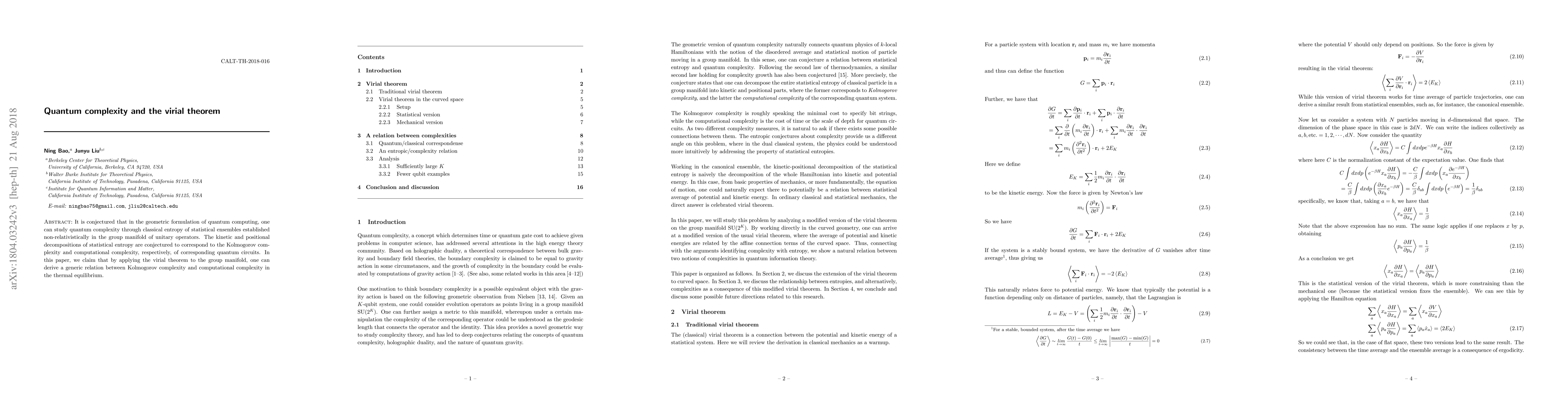 This paper proposes a connection between quantum complexity and classical entropy in quantum computing, suggesting that the virial theorem applied to the group manifold of unitary operators can derive a relation between Kolmogorov complexity and computational complexity in thermal equilibrium.