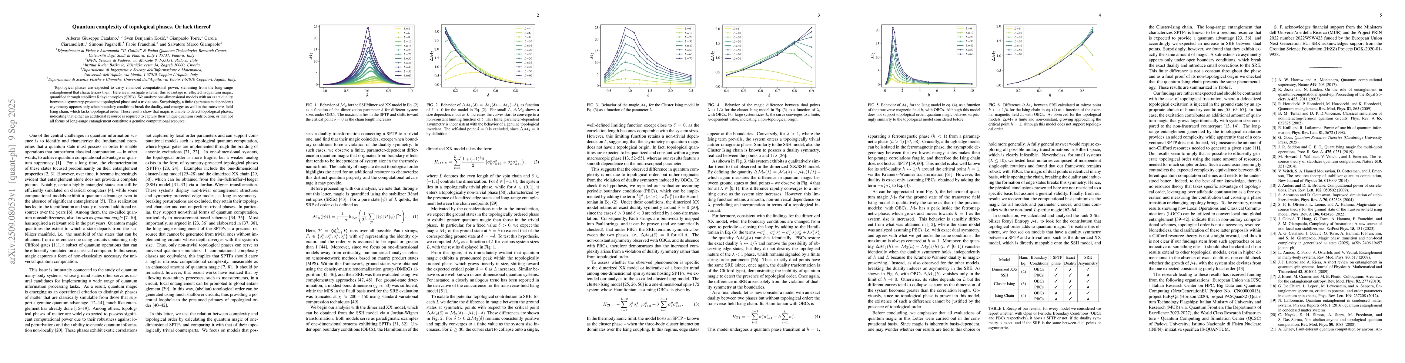 Topological phases are expected to carry enhanced computational power, stemming from the long-range entanglement that characterizes them. Here we investigate whether this advantage is reflected in quantum magic, quantified through stabilizer R\'enyi entropies (SREs). We analyze one-dimensional models with an exact duality between a symmetry-protected topological phase and a trivial one. Surprisingly, a finite (parameters dependent) asymmetry appears only when boundary conditions break the duality, and emerges as well in the transverse-field Ising chain, which lacks topological order. These results show that magic is unable to detect topological phases, indicating that either an additional resource is required to capture their unique quantum contribution, or that not all forms of long-range entanglement constitute a genuine computational resource.